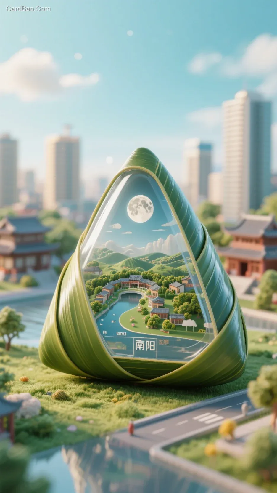 一个粽子形状的创意微缩场景,粽子立体摆放。粽子内部半透明,展示南阳的图像——卧龙岗和月计划。背景为该城市的微缩景象,整体风格3D渲染,具有梦幻感,使用 C4D制作,材质有光泽感。