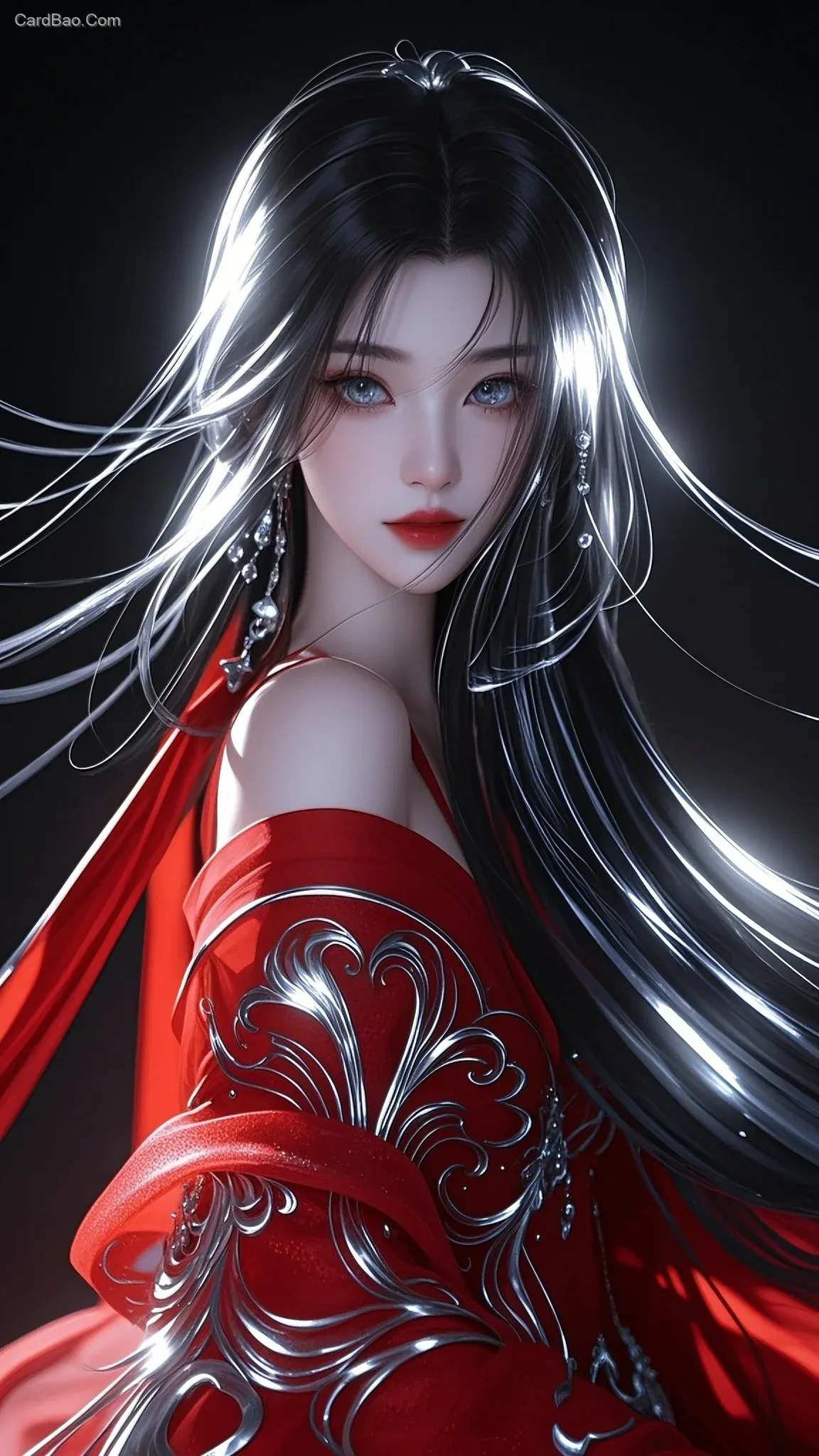 A Chinese-style beauty with an exquisitely beautiful face and snow-white skin, featuring a new 3D ancient aesthetic that embodies timeless elegance. She wears a red sheer dress adorned with intricate silver patterns formed by glowing light trails. Her long hair is composed of metallic silver light strands, boasting a 3D volumetric effect with natural, flowing waves that cascade like water. Against a pure black background, the luminous lines and shadows create a striking contrast, blending ethereal and dreamlike qualities. The composition is breathtakingly gorgeous, enchanting, and opulent. A close-up frontal portrait captures her allure—partially veiled face, mesmerizing silver-glowing eyes, and an air of haughtiness. Rendered in 8K ultra-high definition, the piece highlights the intricate precision of light traces, merging minimalist aesthetics with high dynamic range (HDR) rendering. Subtle dynamic lighting effects animate her hair with a delicate sense of motion.