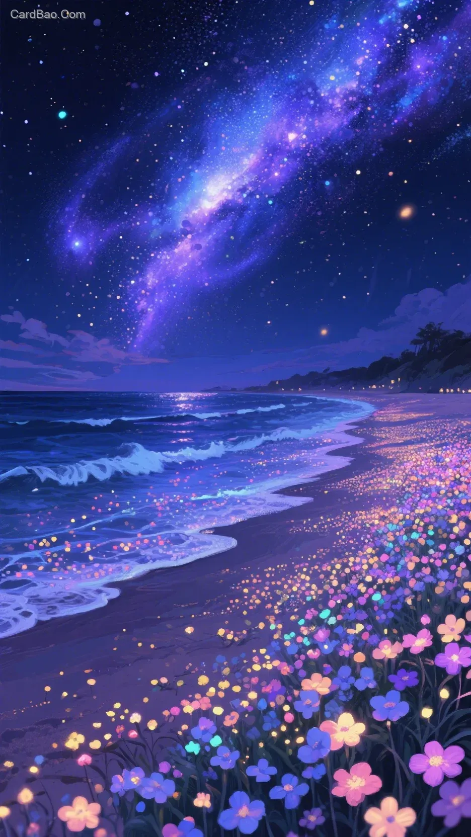 帮我生成一张图片:夜晚,千万颗细小的发光花朵组成的海滩,蓝紫色银河,星汉灿烂,颗粒油画,浪漫古风,炫彩光影,暗夜微光,大广角,超现实主义。图片风格为动漫,比例 9:16。