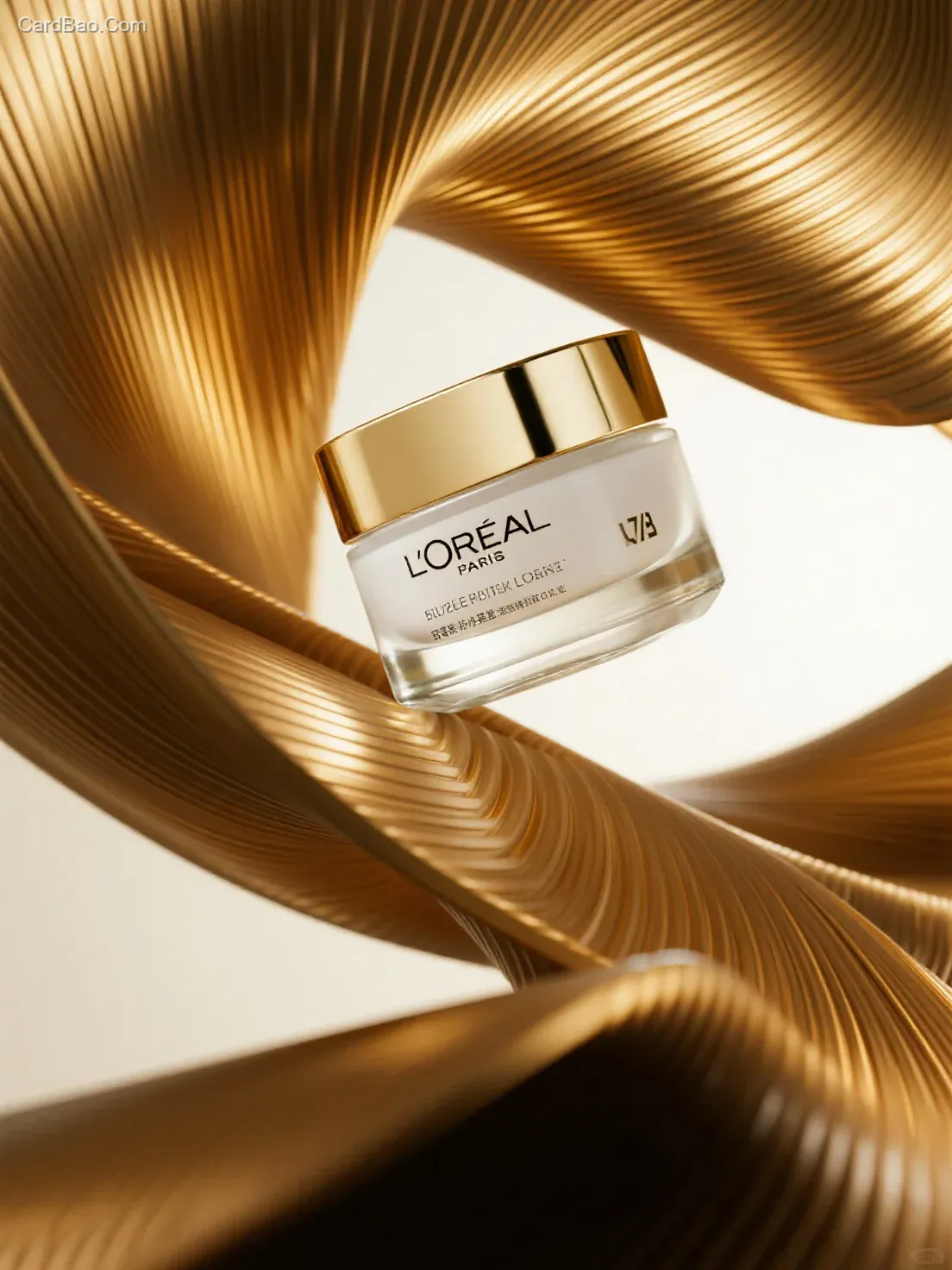 High-end still life photography, close-up shot, L'Oréal Gold Cream, predominantly in platinum tones, the product placed on a golden metal wavy curved surface (with brushed texture, same metallic finish), brushed metal effect, the wavy curve suspended in mid-air.