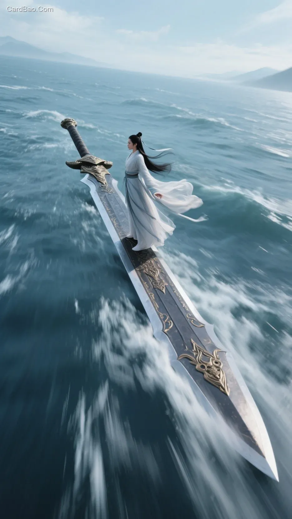 武侠大电影风格,俯拍,一个巨大飞剑在大海上极速疯狂疾驰,动态模糊,一个女修真者衣袂飘飘,站在巨大的飞剑上,高清,4K。