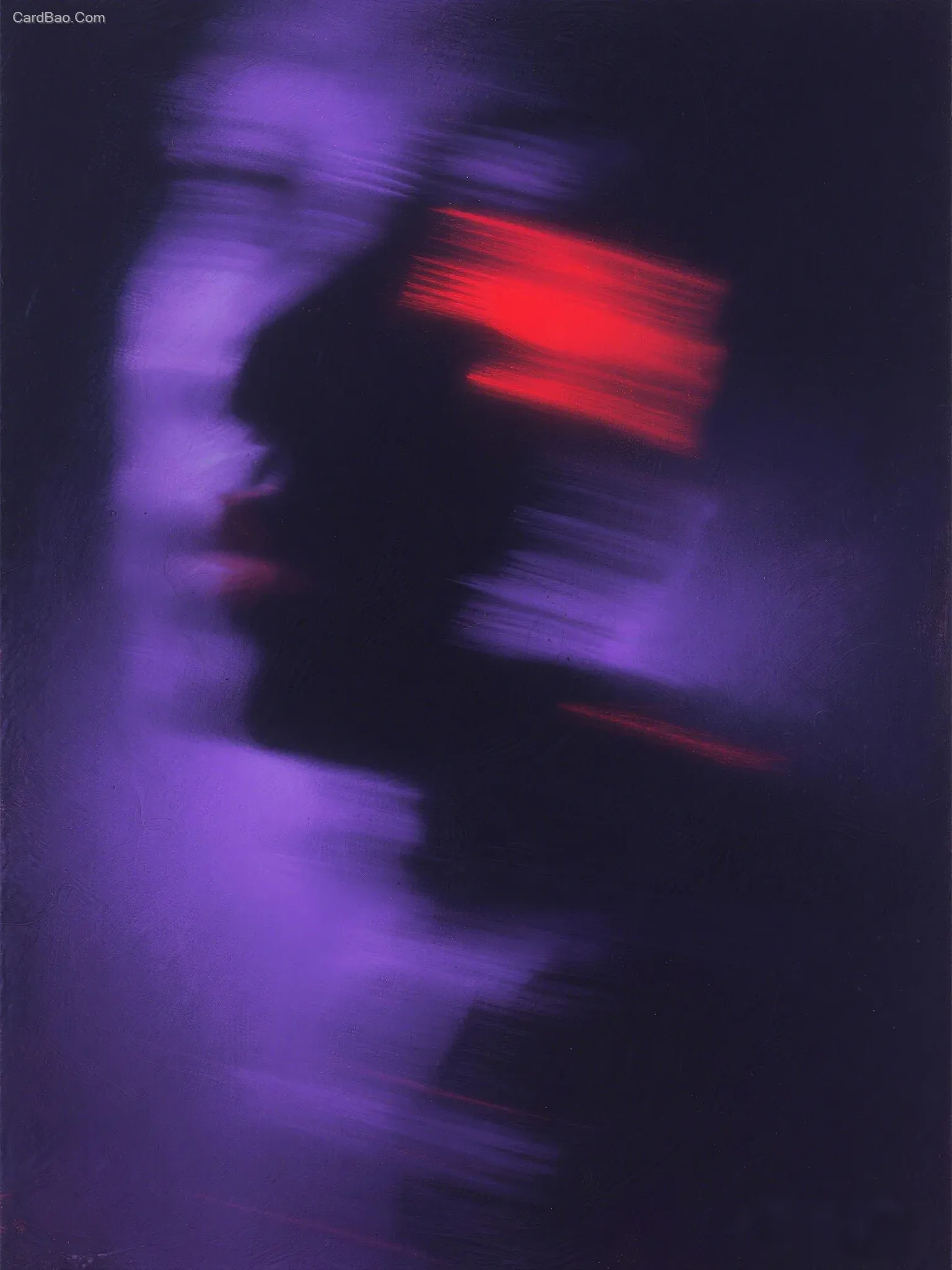 The overall composition is in dark purple tones with red as an accent color. The image features blurry, diffused hues with glowing halos and motion blur effects. It embodies dynamic aesthetics and surrealism, showcasing highly detailed and flawless execution—a true masterpiece.