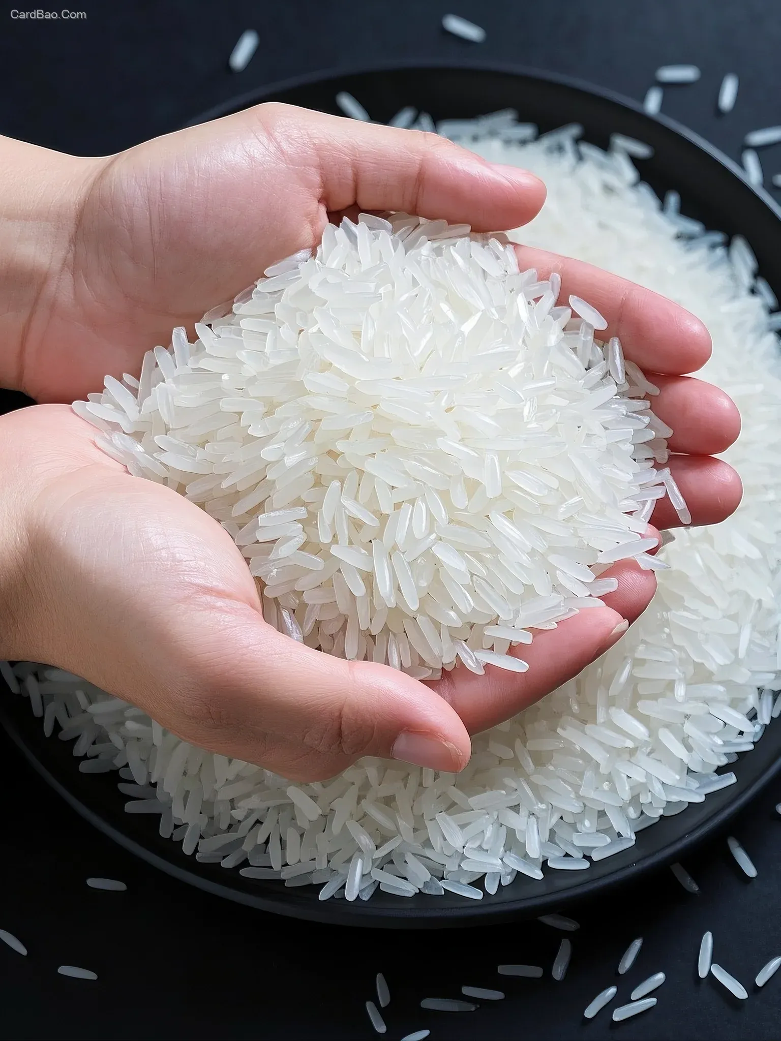 图中展示了一双手从一个黑色的大圆盘中捧起晶莹剔透的长长的粒米,这些长长的米粒被摆放在一双手中,圆盘中装满了同样的米,长长的米粒呈现出一种透明的质感,
