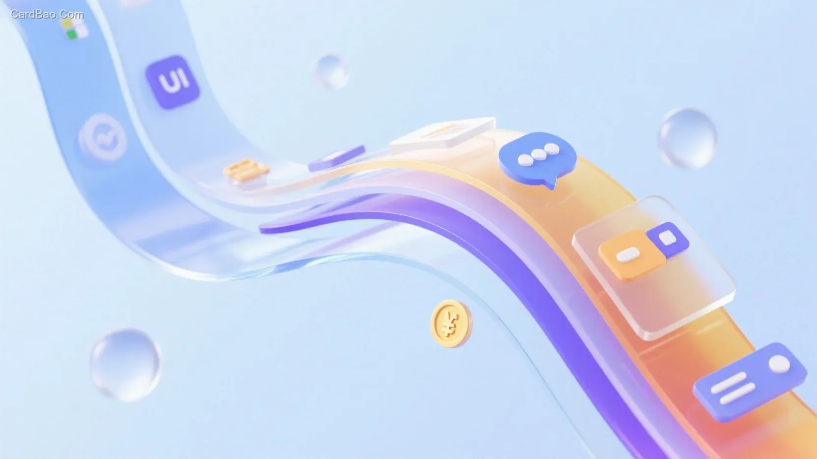 微软风格数字信息可视化,起伏流动的透明玻璃质感宽度铺满的信息带从左上角往右下角飘动,几条信息带特别宽叠在一起,带体呈浅色的蓝色、紫色、橙黄色透明渐变色,具备玻璃反射质感。信息带上集成了各类UI图标,如对话气泡、按钮、卡片、金币等,具有3D立体风格。整体画面背景为浅蓝色纯色背景,光感柔和,带有悬浮球形高光元素。画面整体具有未来感、科技感和数字金融氛围,适用于智能生活、数据流、信息可视化等主题。