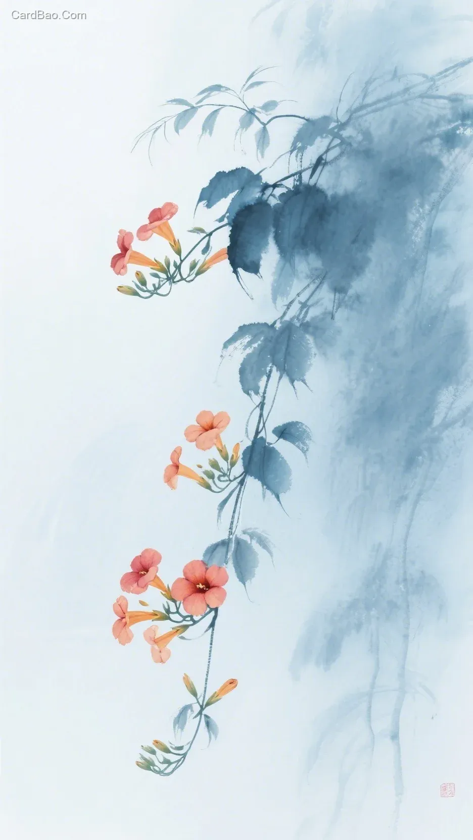 Freehand brushwork, extremely light ink splashing, ancient style, a trellis of trumpet vines, minimalist and aesthetic, serene, hazy, misty, blue-green color palette