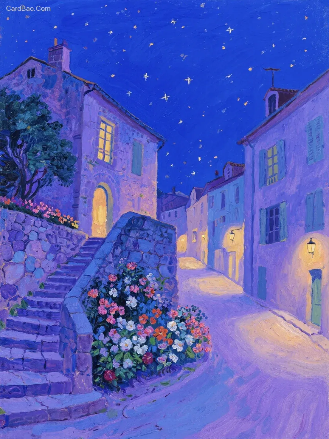 马蒂斯风格,油画,一个宁静的夜晚小镇景象。画面中有古老的建筑、石阶和盛开的漂亮花朵,天空呈现出深蓝色,星星点点,给人一种宁静祥和的感觉。建筑物的灯光柔和地照亮了街道,增添了温馨的氛围。整体色调以蓝色为主,营造出一种梦幻般的效果。