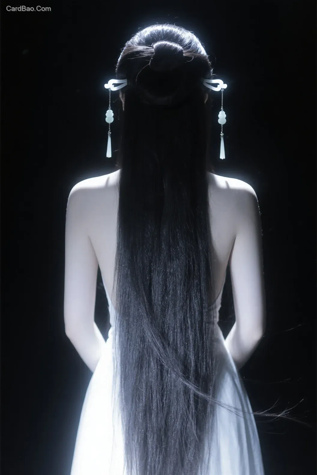 一个以纯黑为背景的画面,采用强逆光轮廓构图,展现廿岁聂小倩(乌黑长发,垂挂髻,双垂鬟髻,插白玉材质青梅步摇)的剪影轮廓。胶片摄影作品,明度中高,色调为冷调银灰,饱和度低。视点为水平正后方平拍,背部特写,影调呈现细腻发丝质感。光的强度柔和,方向为顶部散射光,硬度软,均匀照亮头发;色温偏冷白,质感如真实环境光自然。身材曲线完美、细腰,头发乌黑(自然光下显深灰调 ),长度及腰,为直顺长直发,大量的头发,非常多的头发,发质粗,发丝油亮且根根分明,受顶部光照射有自然光泽,明暗过渡柔和。人物背对镜头,显现人物曲线,长发披散在整个背部和臀部(背部和臀部全部被披散的长发覆盖遮挡,看不见任何皮肤和衣物),全部的头发被强逆光轮廓照射呈现发丝发光,着重头发质感,发丝分离度高,发尾两侧相互交织,具大量胶片颗粒感,氛围感足,层次丰富,线条清晰,细节生动,真人写实逼真,传递高级感与现场感,超高清32k,还原发丝真实状态,尽显光影美学,适合用于发型教学复刻 。32K,摄影大师杰作。