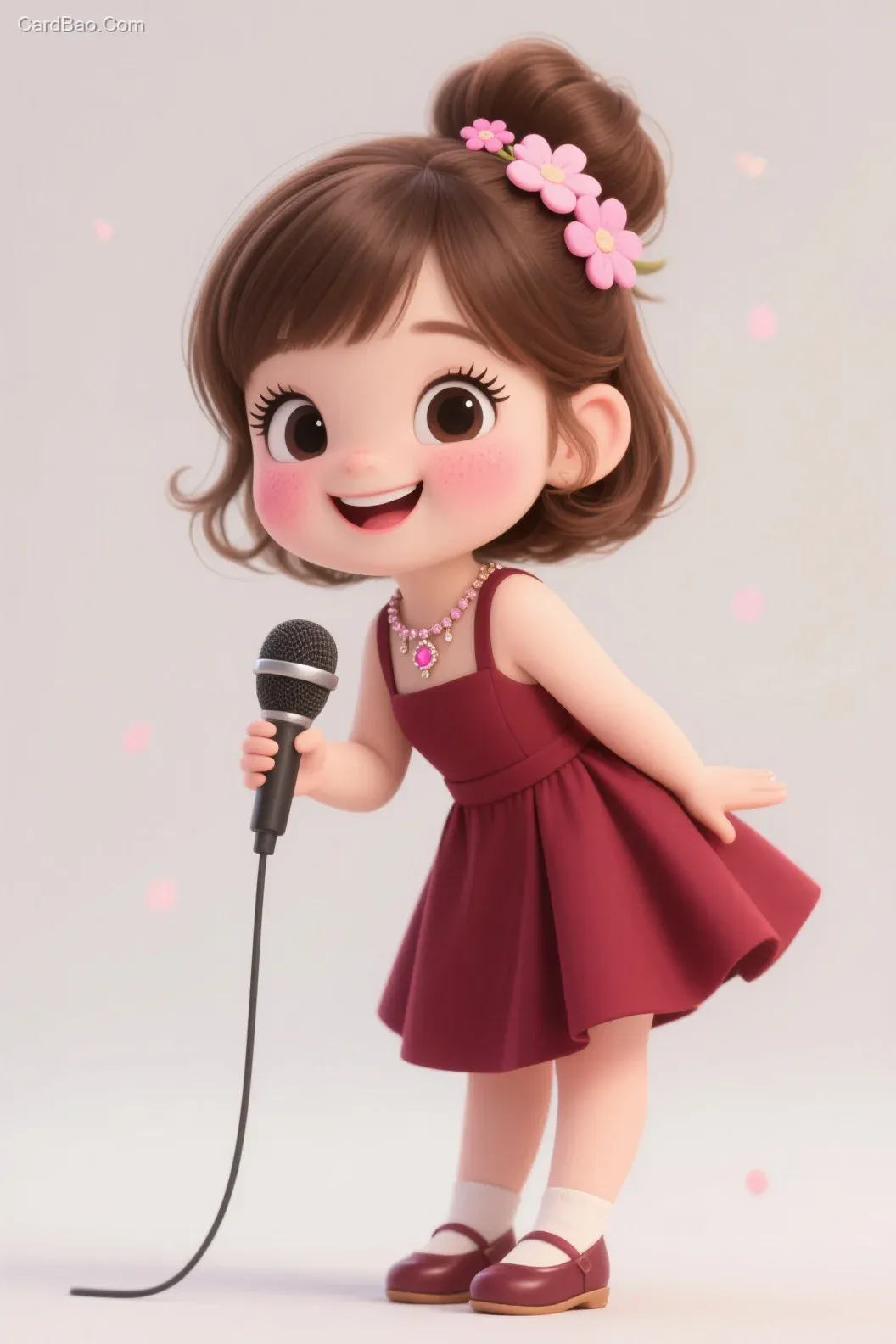可爱小美女,棕色头发,发髻造型,空气刘海,头顶粉色小花朵装饰,眼睛明亮有神,长卷睫毛,脸颊带粉色腮红,戴装饰项链,笑容灿烂,穿着有酒红色吋尚裙装,稍稍弯着腰,歪头萌态,脚穿搭配裙子的小鞋,极简背景,背景有小点缀,卡通风格,甜美可爱,精致细节,有现实主义,顶级8k画质,Q萌,手拿小话筒