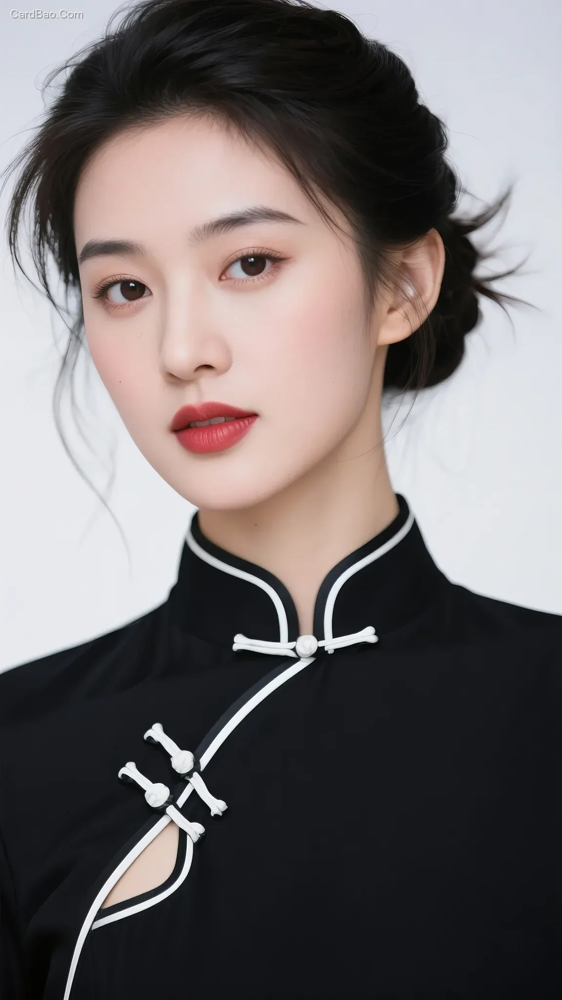 绝色美人,肤白貌美唇红齿白,盘发微乱,黑色白边旗袍领斜禁小衫,精致女孩