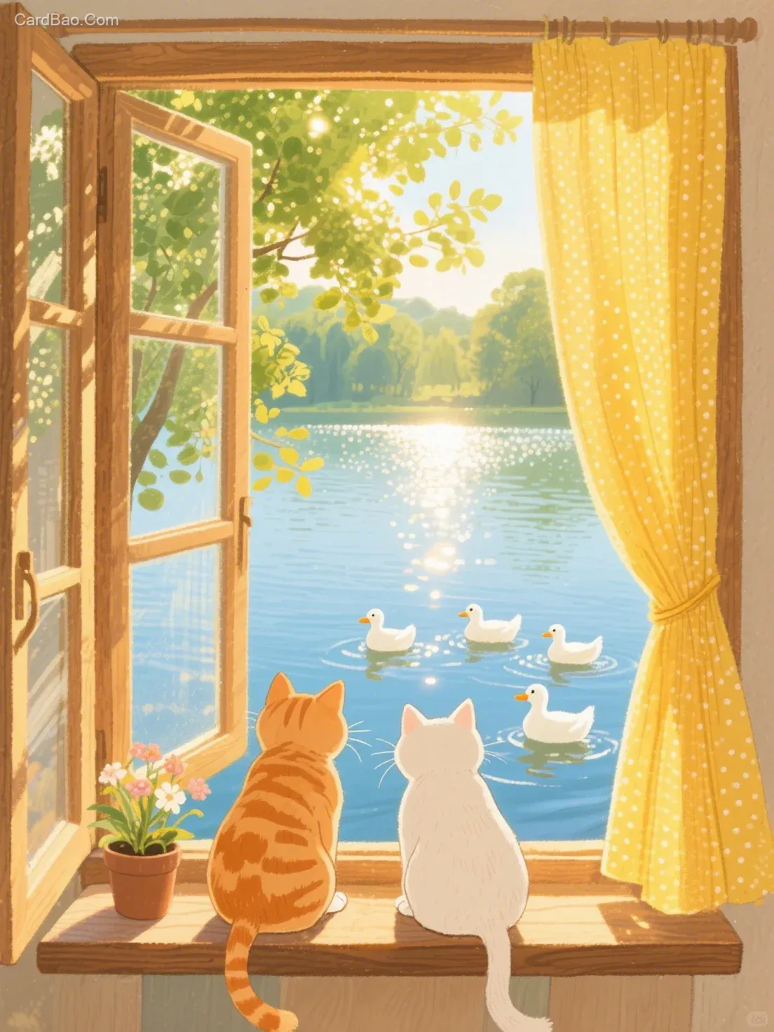 Picture book illustration featuring a wooden window with drawn-back yellow curtains. Inside, an orange cat and a white cat sit with their backs to the viewer, gazing out the window. A small potted flower sits on the windowsill. Outside, a sparkling lake stretches into the distance, dotted with a few white ducklings. The sunny scene shows lush green trees along the lakeshore, their leaves shimmering in the sunlight. Warm sunlight streams through the window, creating a cozy and healing atmosphere. High-resolution with intricate details, executed with ink wash techniques, line art, and pointillism.