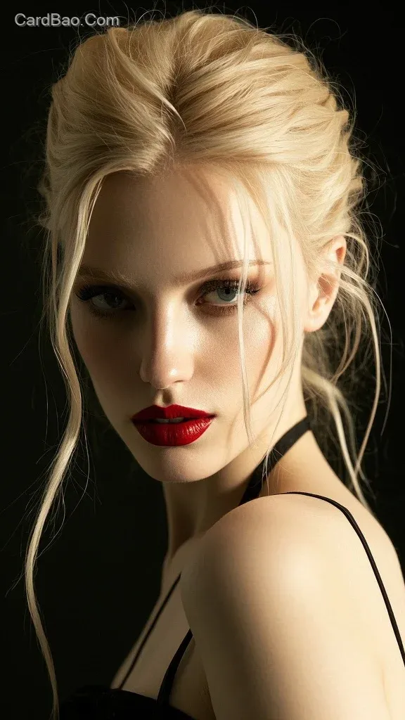 黑色背景,欧洲金发美女模特,冷白皮,微乱蓬松的长发盘起,高级精致的脸庞,碧眼红唇,夜店妆。微醺,迷人,性张力,性感诱惑的服饰搭配。lomo风格,明暗冲突,8k画质。极简主义。