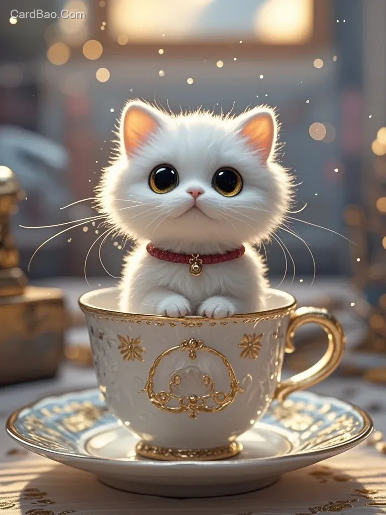 茶杯中超级小的袖珍小萌猫,长长的白色绒毛,睁着两只圆溜溜的眼睛,超级可爱,3D卡通,超现实主义,超梦幻 超清