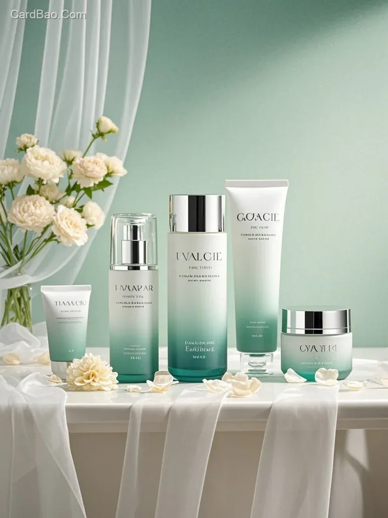 这张图片展示了一套淡绿白色渐变的护肤品,主要是展示这款产品的拍摄,产品站在桌子上,桌上铺着白色的丝绸,桌上还洒落了少量花瓣,产品背后还有一点模糊的花卉和透明的纱帐,背景是淡绿色的清爽渐变背景,背景干净整洁,产品突出,整体调性的清新的浅绿色,整体是淡雅风格的,画面内容丰富,超强质感,超真实质感,超强品质感,大牌质感调性,大面积留白,居中构图,4K