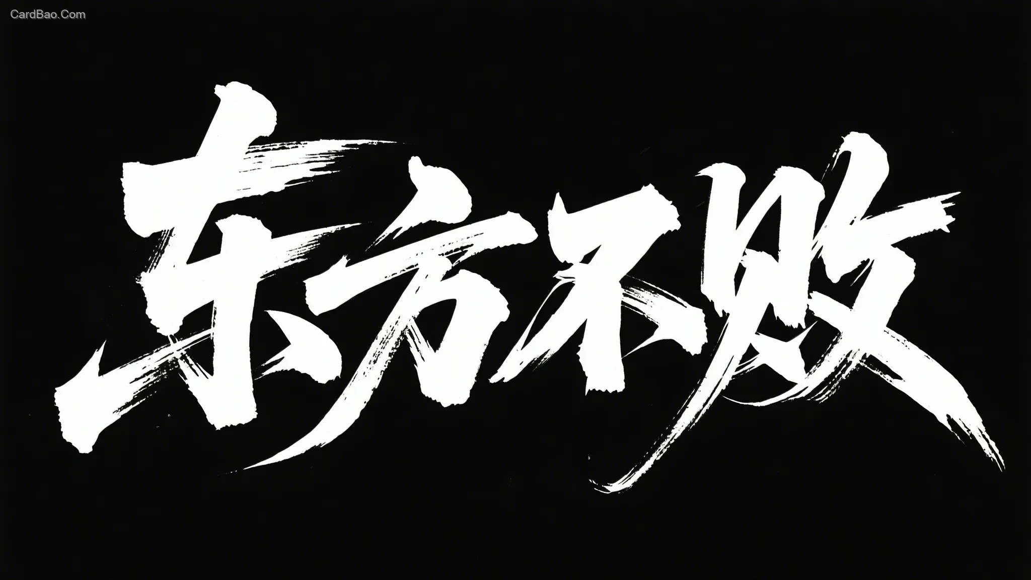 标题字体设计,文字“东方不败”字体狂野奔放,笔画飘逸,富有动感和张力,飞白,白色字,纯黑色背景。