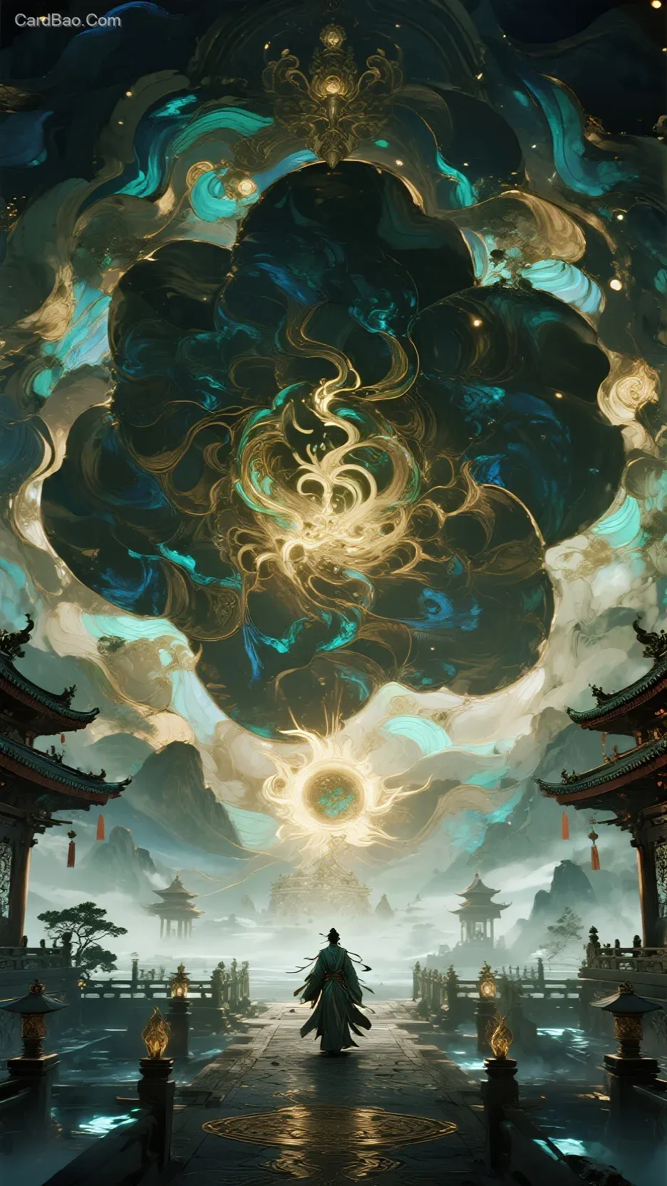 宏大,微光,宿命感, 凹陷空洞,华丽,曜变,中式,修仙,大场面,32k画质,电影质感,华丽,仙魔大陆,宏伟壮观,完美画质