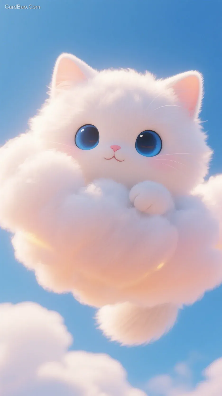 A cloud-formed cat floats in the azure sky, with round, big blue eyes and fluffy fur that resembles the texture of cotton candy. The soft, gradient colors create a soothing and healing atmosphere, as warm sunlight filters through the clouds, casting a gentle glow. The scene is rendered in high-resolution 3D style.