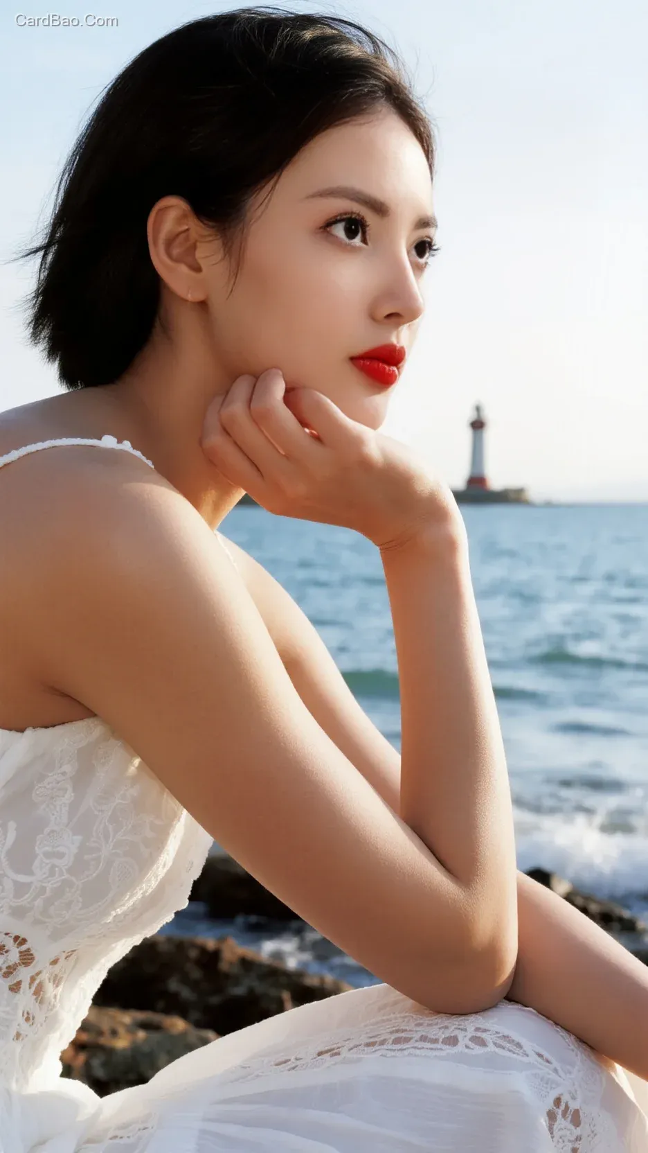 ##小姐姐坐在礁石上,气氛活跃,手托下巴,背景,海浪,灯塔。画面清晰写实,超高清镜头,生成图片。