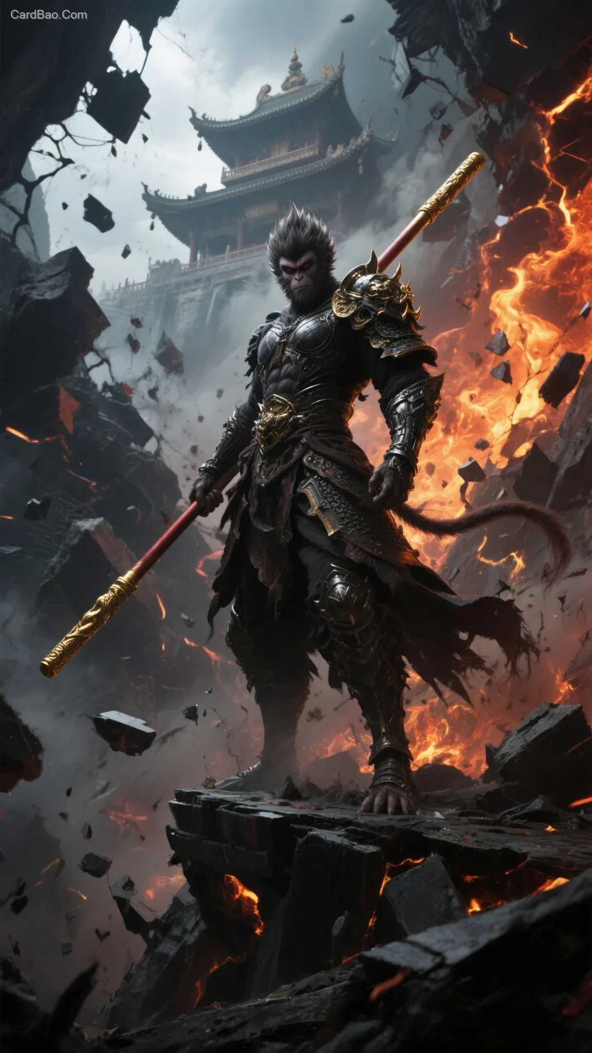 画面主体:孙悟空暗黑版,身披破碎战甲,金箍棒在手,站在被毁灭的天宫之上;