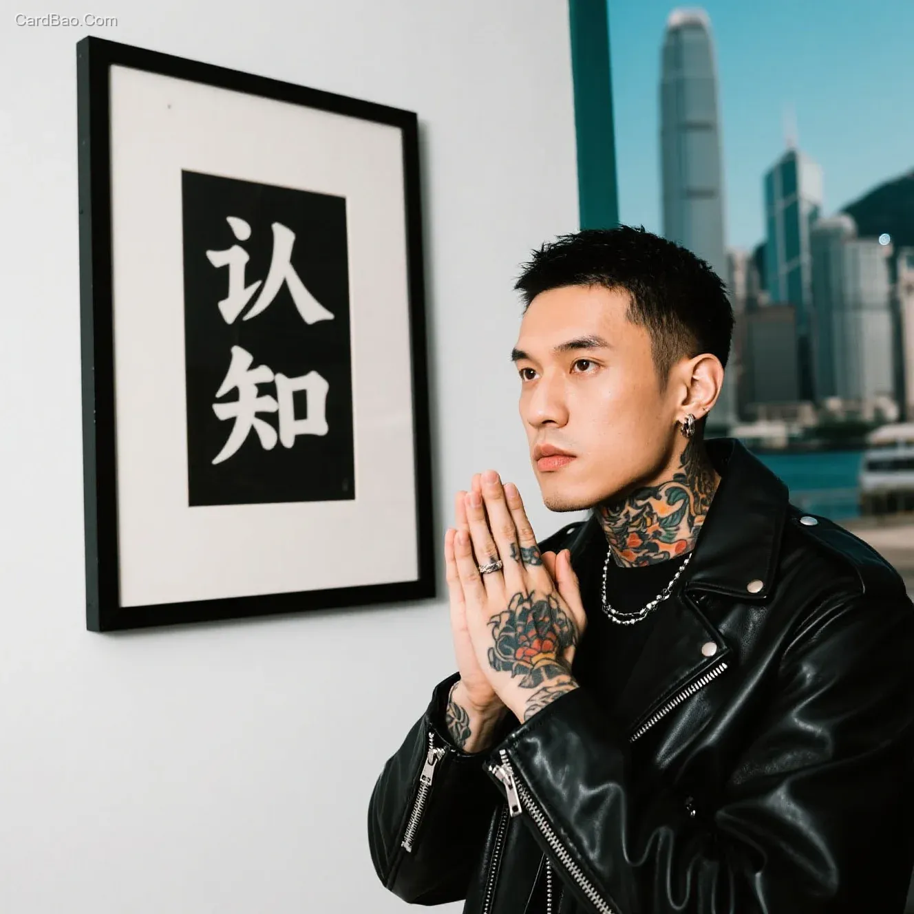 港风景 皮衣 花臂男眼睛注视着挂画双手合十 挂画带框写着认知