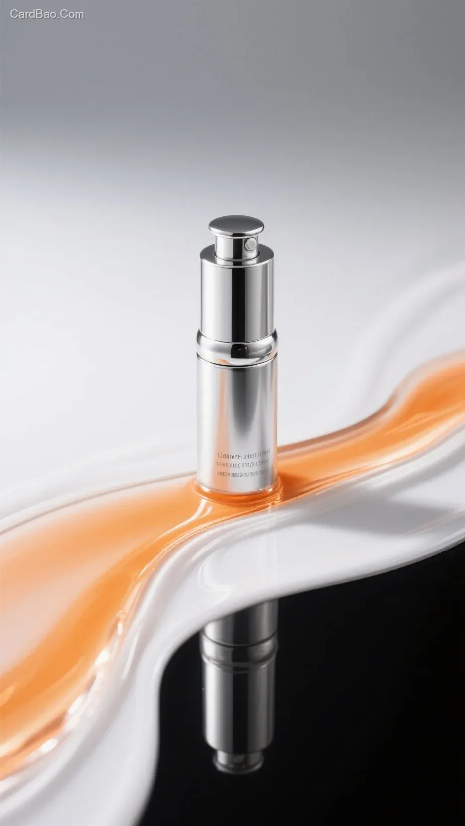 一张化妆品照片。在柔和的银白色背景中,一瓶银色金属材质的精华,放置在一条优雅的透明流体之上。明亮的光线照亮了整个场景,突出了两个元素的质感和色彩。橙色和白色的光滑曲线与深色形成鲜明对比,使构图更具深度,同时也增添了精致感和细节。