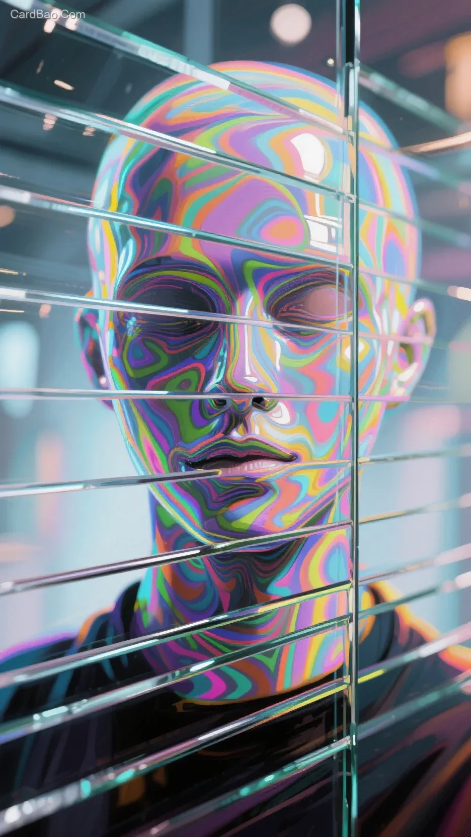 无面人,多重面幻像 虚与实 虚影动态模糊,色彩致幻 曜变 动态模糊,丟勒荧光笔马克笔结构平涂 超细节 , 意识流绘画,丟勒荧光马克笔结构平涂 胶片感拍摄,玻璃强反光透明质感,分形分割玻璃后面,条形玻璃分割分形的视错觉人像,玻璃分割分形,视觉欺骗 ,动态感,新视觉,三维立体空间