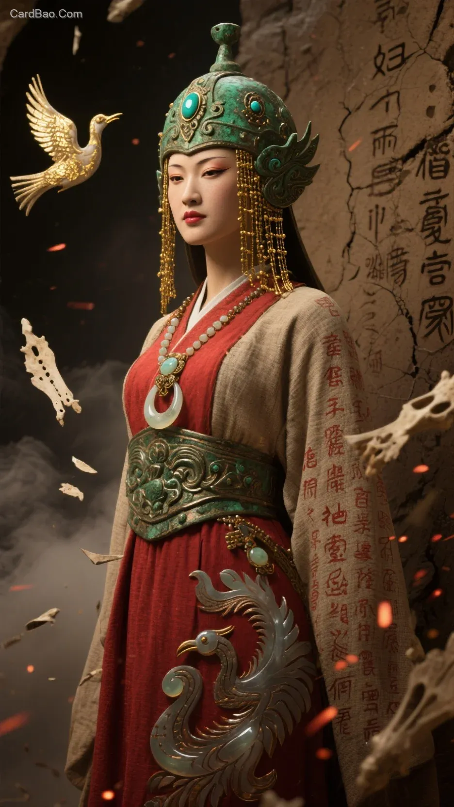 Aesthetic Keywords: Floating oracle bone inscriptions, rendered in divinatory brushstrokes, encircle her figure. The text content consists of sacrificial records unearthed from Fu Hao’s tomb, with the bone-script characters appearing semi-transparent and cast in a bronze-like material, their gaps emitting a faint vermilion glow. In the background, dark golden mist seeps from the cracked rammed-earth ruins of Yinxu, forming the silhouette of a black bird.