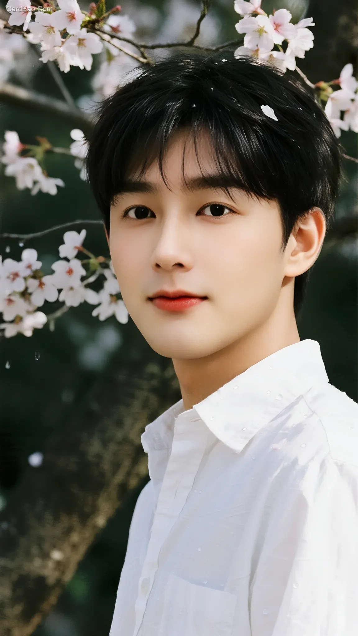 ## A young man in a white shirt leans against an ancient peach tree, with natural light filtering through petals and falling on his shoulders. His hair flutters in the wind, showcasing realistic skin texture and detailed shirt folds. The shallow depth of field softly blurs the background, while 8K ultra-high-definition photography captures the glistening reflections of raindrops on his eyelashes.