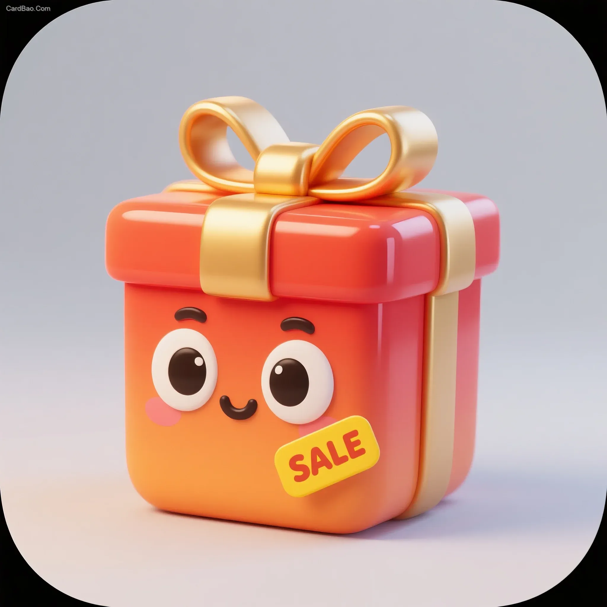 可爱卡通风格的3D礼物盒图标,橙红渐变色彩,高光光泽质感,大眼睛和表情符号,附带黄色贴纸“SALE”,金色蝴蝶结装饰,明亮背景,整体风格类似扁平化+3D融合,视觉活泼,适合用于移动应用图标或电商促销设计,Q萌风格,浅灰色背景