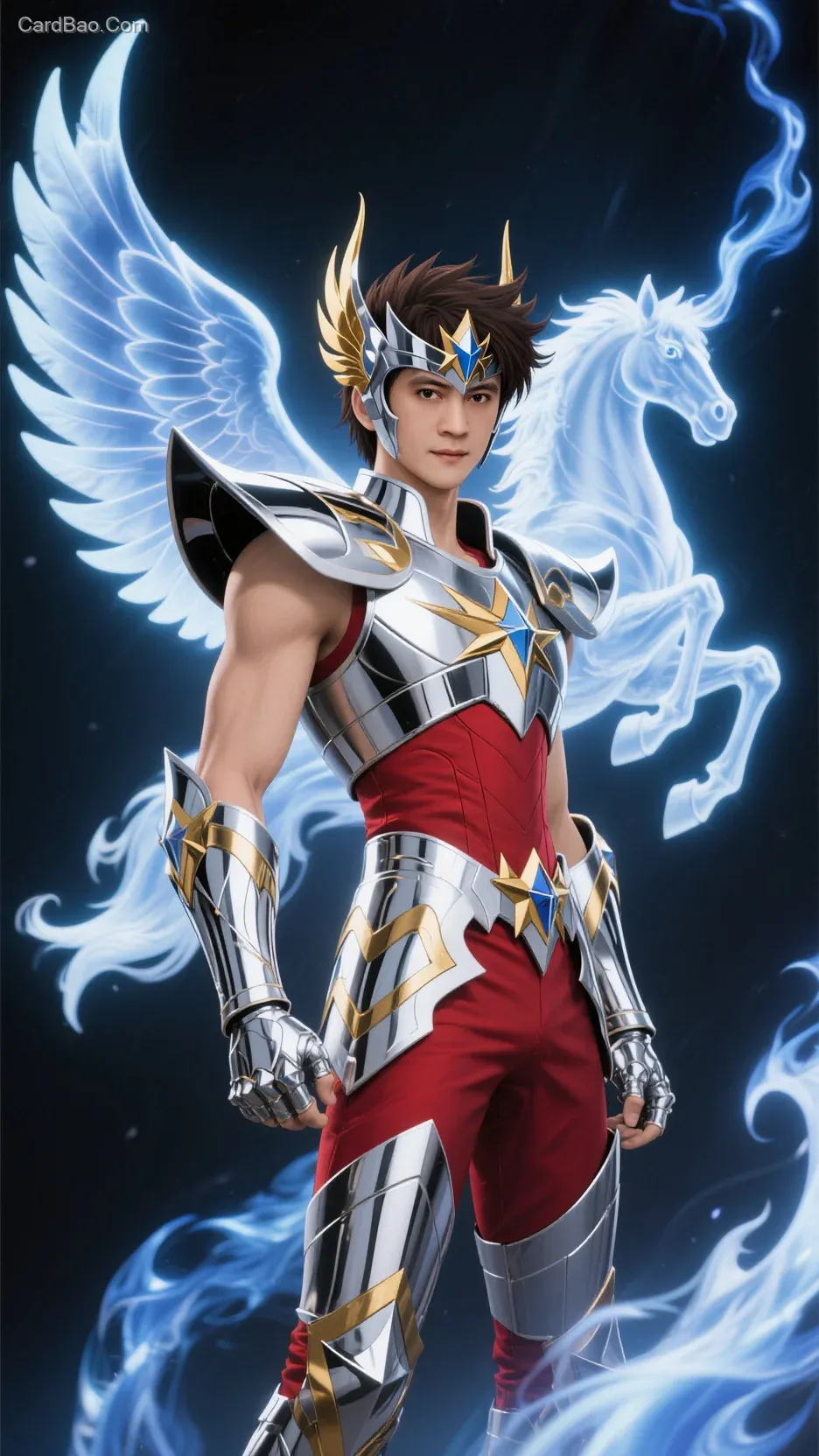 ## Dreamy Style, 3D High-Quality Rendering, Pegasus Saint Seiya, short brown-black hair, wearing the Pegasus Cloth. The Cloth is primarily silver and red, adorned with gold and white accents. The shoulder armor is sharp, appearing extremely ornate and dazzling. The helmet resembles a phoenix head, with sharp antennae wrapping around the head, exuding nobility and dominance. The metallic texture gleams with a titanium-silver radiance, complemented by Pegasus wings on the back, majestic and commanding—referencing Saint Seiya. The environment features a phantom-like spread of Pegasus wings, surrounded by blue-white flames, dark and backlit for a dramatic, oppressive effect. The visual impact is stunning, worthy of award-winning excellence. The image is highly detailed, boasting ultra-high resolution up to 32K UHD, sharp focus, and exceptional quality—truly a masterpiece, lifelike in its portrayal.