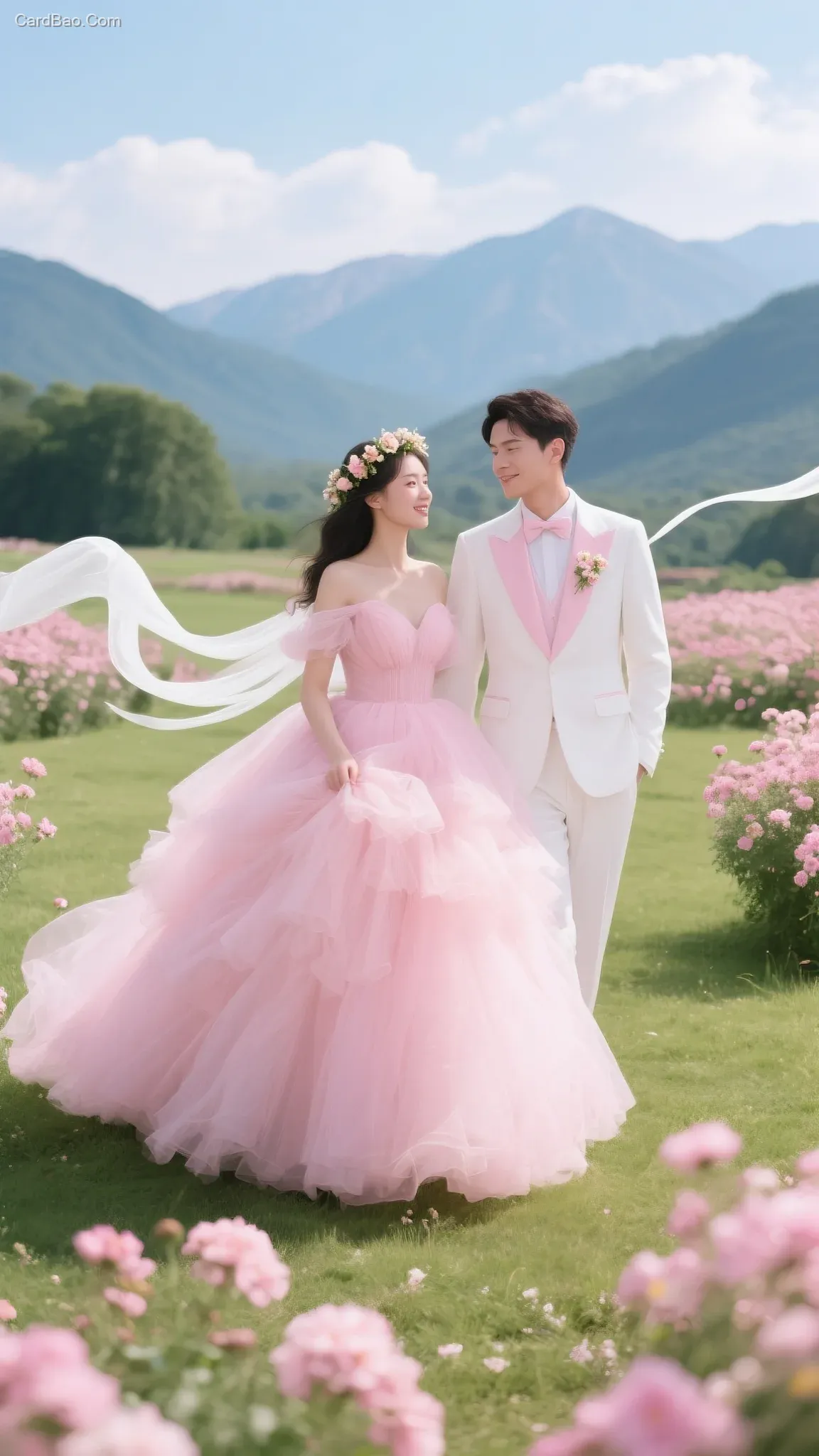 一对新人在户外草坪拍摄的婚纱照,新娘身着粉色蓬松大裙摆婚纱,头戴花环;新郎穿着白色西装搭配浅粉色装饰,胸前有小花点缀。周围是大片盛开的粉色花朵,背景是蓝天白云、连绵山峦,还有白色丝带飘动,营造出浪漫、甜美、梦幻的氛围