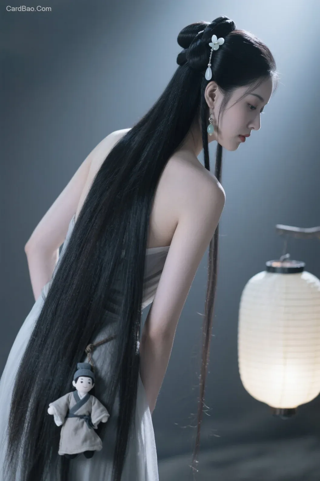 胶片摄影作品,明度中高,色调为冷调银灰,饱和度低。视点为水平正后方平拍,景别是头部及背部特写,俯视角度,影调呈现细腻发丝质感。光的强度柔和,方向为顶部散射光,硬度软,均匀照亮头发;色温偏冷白,质感如真实环境光自然。廿岁聂小倩(乌黑长发梳成垂挂髻,扎双垂鬟髻,插白玉材质青梅步摇,腰挂着宁采臣小布偶),身材曲线完美、细腰,头发乌黑(自然光下显深灰调 ),长度及腰,为直顺长直发,大量的头发,非常多的头发,发质粗,发丝油亮且根根分明,受顶部光照射有自然光泽,明暗过渡柔和。人物背对镜头,俯身,显现人物曲线,长发披散在整个背部和臀部(背部和臀部全部被披散的长发覆盖遮挡,看不见任何皮肤和衣物),全部的头发被大型探照灯笼罩照射散发强烈发丝光(灯不出现在画面内),着重头发质感,发丝分离度高,发尾两侧相互交织,具大量胶片颗粒感,氛围感足,层次丰富,线条清晰,细节生动,真人写实逼真,传递高级感与现场感,超高清32k,还原发丝真实状态,尽显光影美学,适合用于发型教学复刻 。32K,大师杰作。