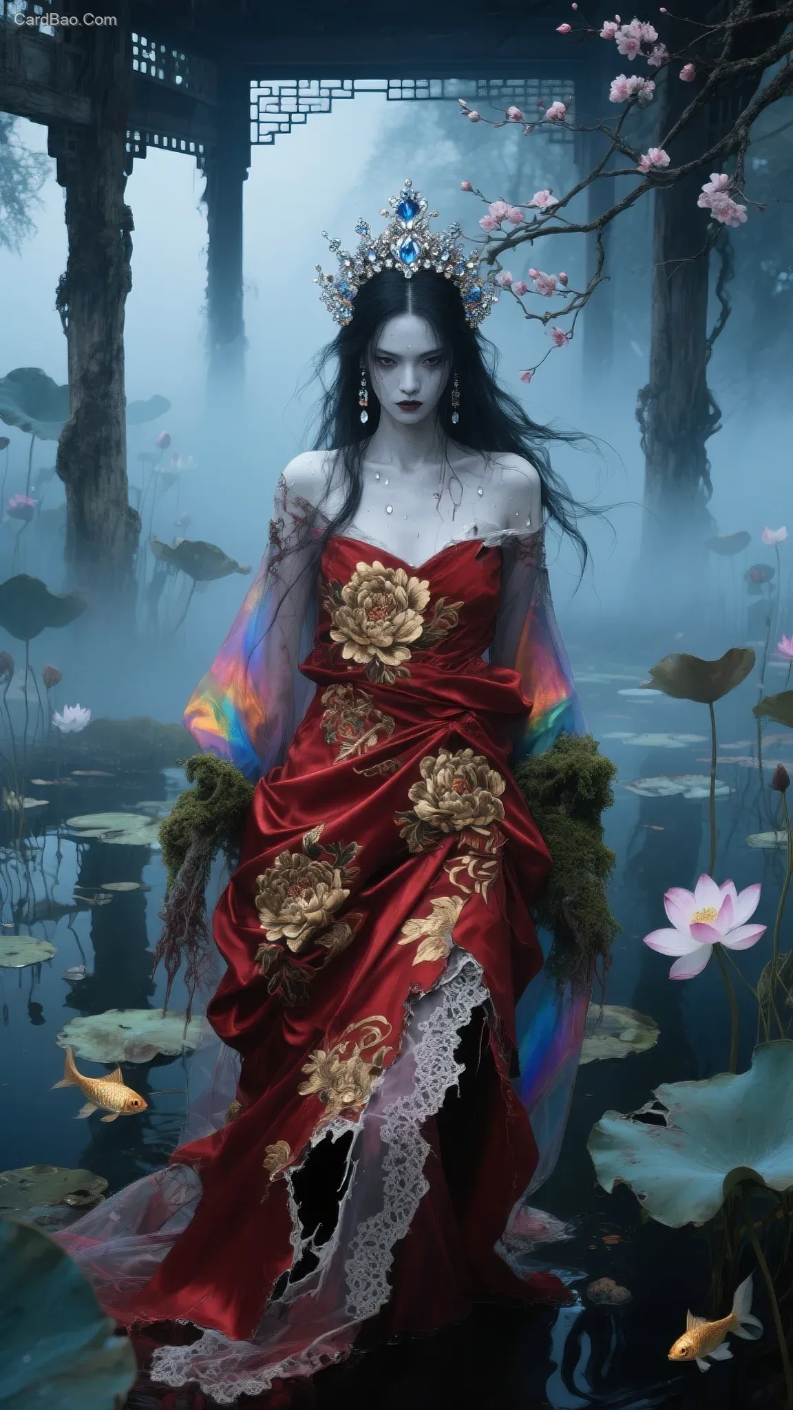 中式美学,中式恐怖,雾神栖于腐木廊桥,身着现代解构暗红色绸缎层叠裹身且金纹牡丹在纱质破损处绽放(服饰完美的与周围环境色相融过度)、袖口拼接苔藓真丝流淌虹彩的服饰,镶钻头饰生长出晶簇与桃枝,素白面容半掩于败荷间,犀利的眼神直视屏幕,生物刺绣皮肤有汗珠滚落,荷花池被雾感粒子光效笼罩,有金鱼藻蔓,荷花池神境,雾感粒子光效笼罩的水墨丹青场域,哑光油画基底浮现浮世绘色谱的场域,俯瞰镜头,病变美学与高定华服超现实共生,朦胧光尘,雾感,柔焦,蓝色调,服饰精致刺绣复杂繁琐图腾,蕾丝花边不对称,服饰残破不堪,诡异,长发碎乱飘逸动感,影级震撼感和视觉冲击,阴森氛围感拉满,风格是超现实绘画、水墨丹青、哑光油画
