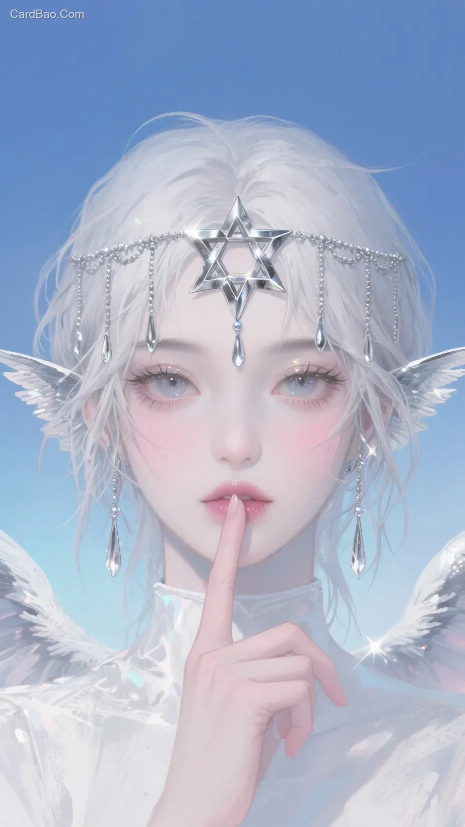 女,天使般的面孔,杏眼,六羽翅,白皙的皮肤,银色金属流苏遮挡额头,垂坠感,哥特式妆容,眼部妆容深邃神秘。发丝凌乱细腻。