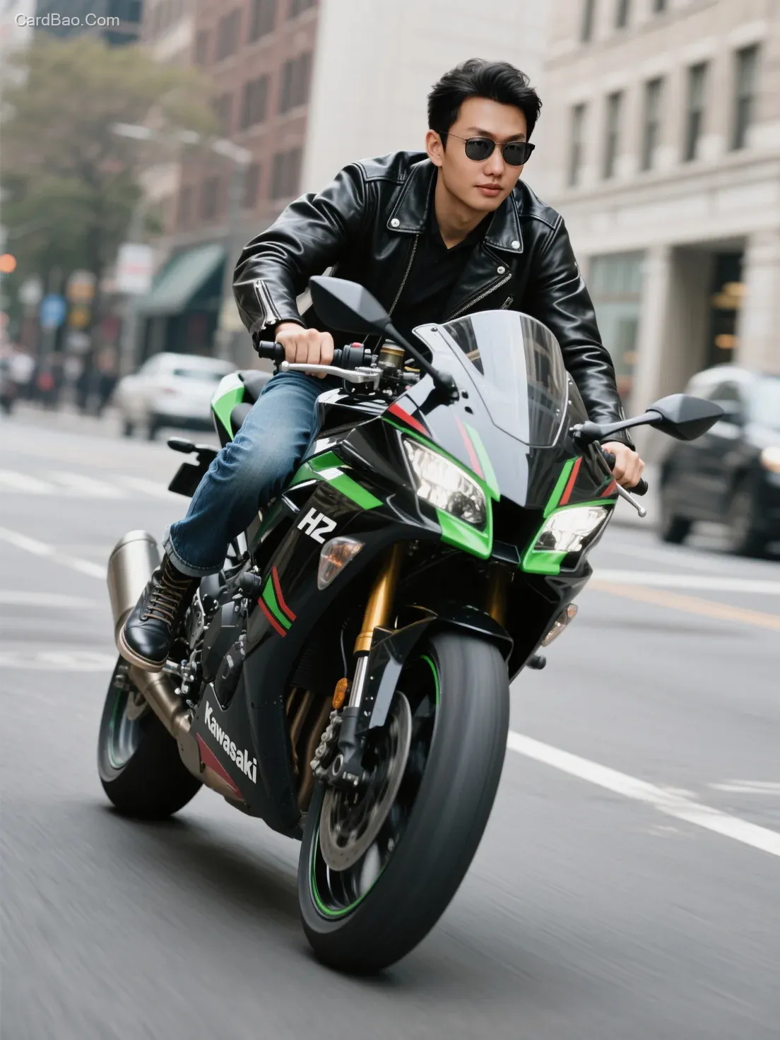 ## 32K Ultra HD footage, a handsome rider on a Kawasaki H2 motorcycle wearing a black leather jacket and blue jeans. With sunglasses, high-top leather shoes, and focused gaze ahead, speeding swiftly through urban streets. The color tone has a cinematic quality.