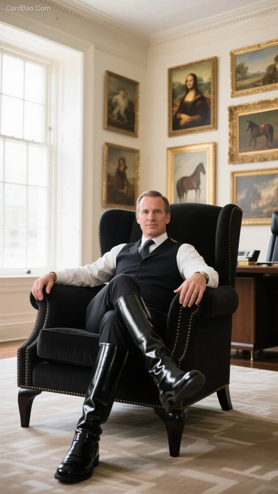 一个欧美男老板马术爱好者,一位粗腿老板,准备去骑马,已穿好马甲马裤马靴坐在豪华办公室里乌黑发亮造型豪气十足的高背单人老板沙发椅上整装待发,马靴靴筒光亮笔挺,靴面光亮大褶,办公室墙上挂满世界名画,办公室光线充足,明亮。比例 9:16。