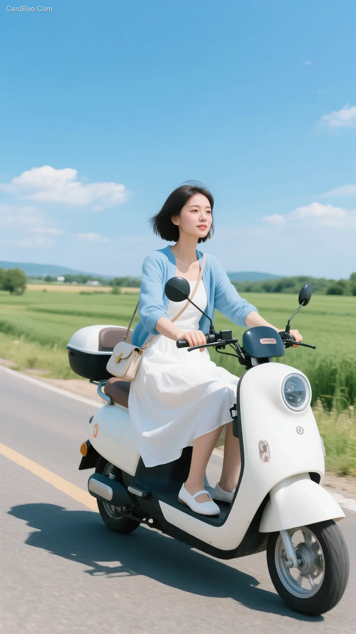 A 30-year-old beautiful woman with short hair, in 32K ultra-high-definition quality, featuring a delicate face, beautiful eyes, and long eyelashes. She has a medium, tall build, wearing a white dress with a light blue jacket and white flat shoes. She carries a small crossbody bag and rides an electric scooter along a rural road, her gaze fixed on the direction of travel.