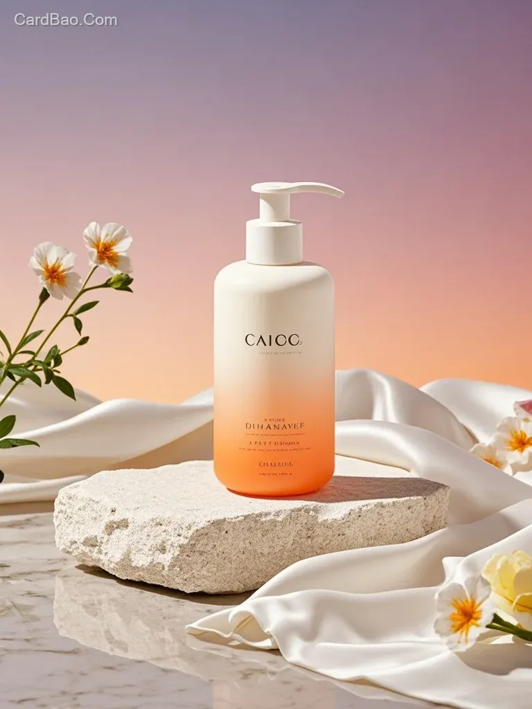 这张图片展示了一款橙白色渐变的身体乳,主要是展示这款身体乳产品的拍摄,产品站在白色的石块上,大理石桌面,桌上铺着白色的丝绸,产品背后还有一点模糊的植萃和花卉,背景是淡橙粉紫色渐变的夕阳天空,整体是淡雅风格的,整体调性是淡粉橙色的,画面内容丰富,超强质感,超真实质感,超强品质感,大牌质感调性,大面积留白,居中构图,4K