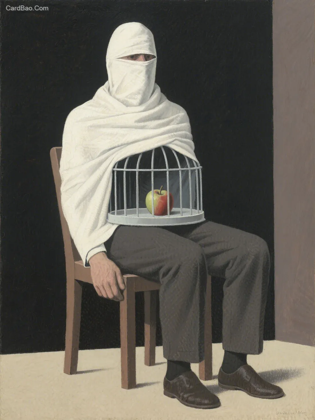 雷尼马格利特的抽象画作,蒙着白布的男人坐在椅子上,身体是个笼子,里面有一个苹果