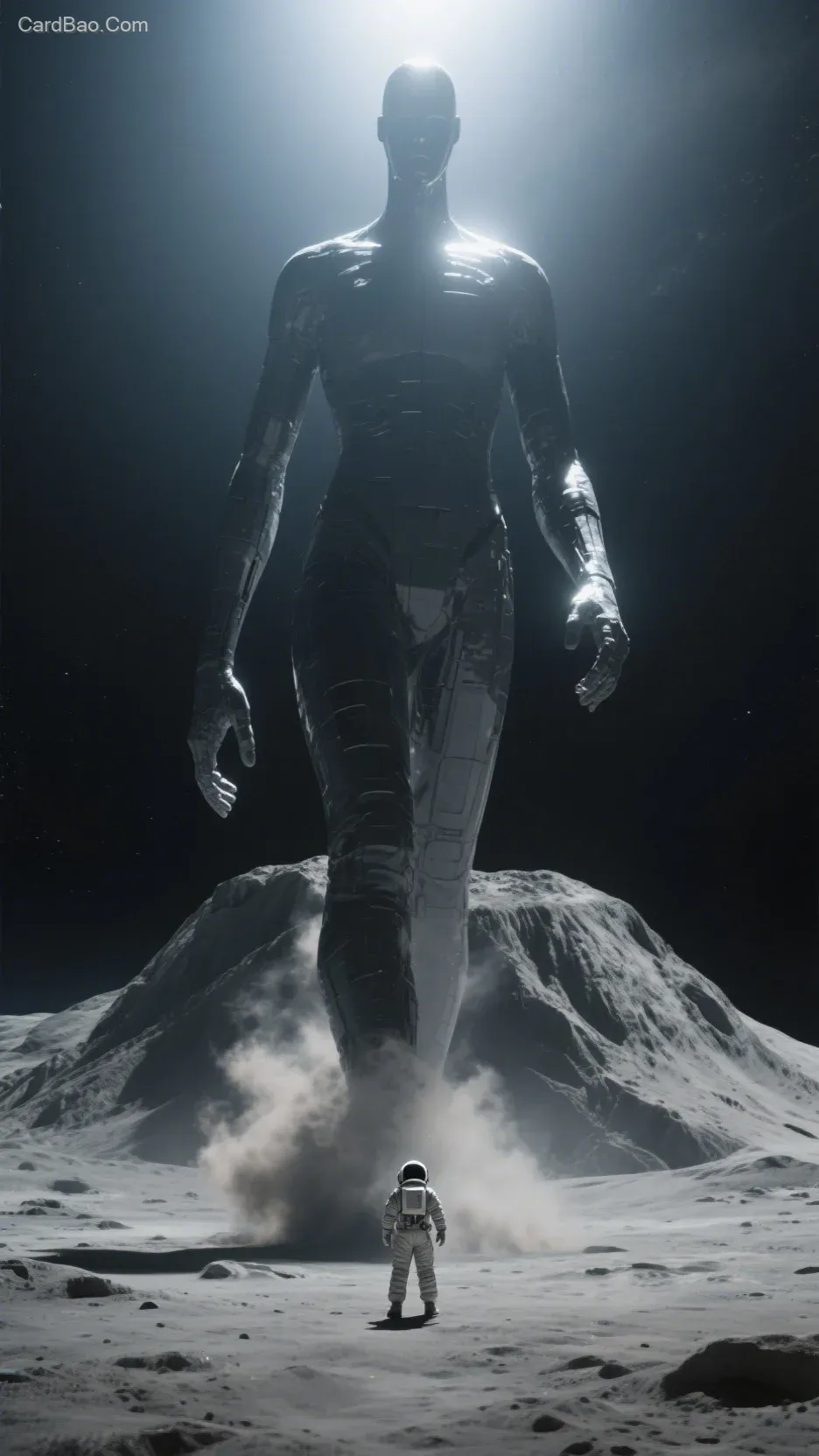 A colossal being, 500 meters tall, with a slender and elongated physique, cyberpunk style, enormous in size, under intense sunlight, reflective surfaces, shot with a telephoto lens, frontal view, symmetrical composition, set against the lunar surface with a dull color palette. The giant emerges from behind a small hill, walking with oppressive force, kicking up clouds of dust below. Its face is gaunt and elongated, set against the vast, pitch-black expanse of space. The scene exudes an overwhelming presence, as if the giant merges seamlessly with its surroundings. The ambient lighting is dim, captured in a realistic photographic style, with flawed exposure and poor focus. Beneath the towering figure, a tiny astronaut, insignificant as an ant, gazes up in shock and awe.