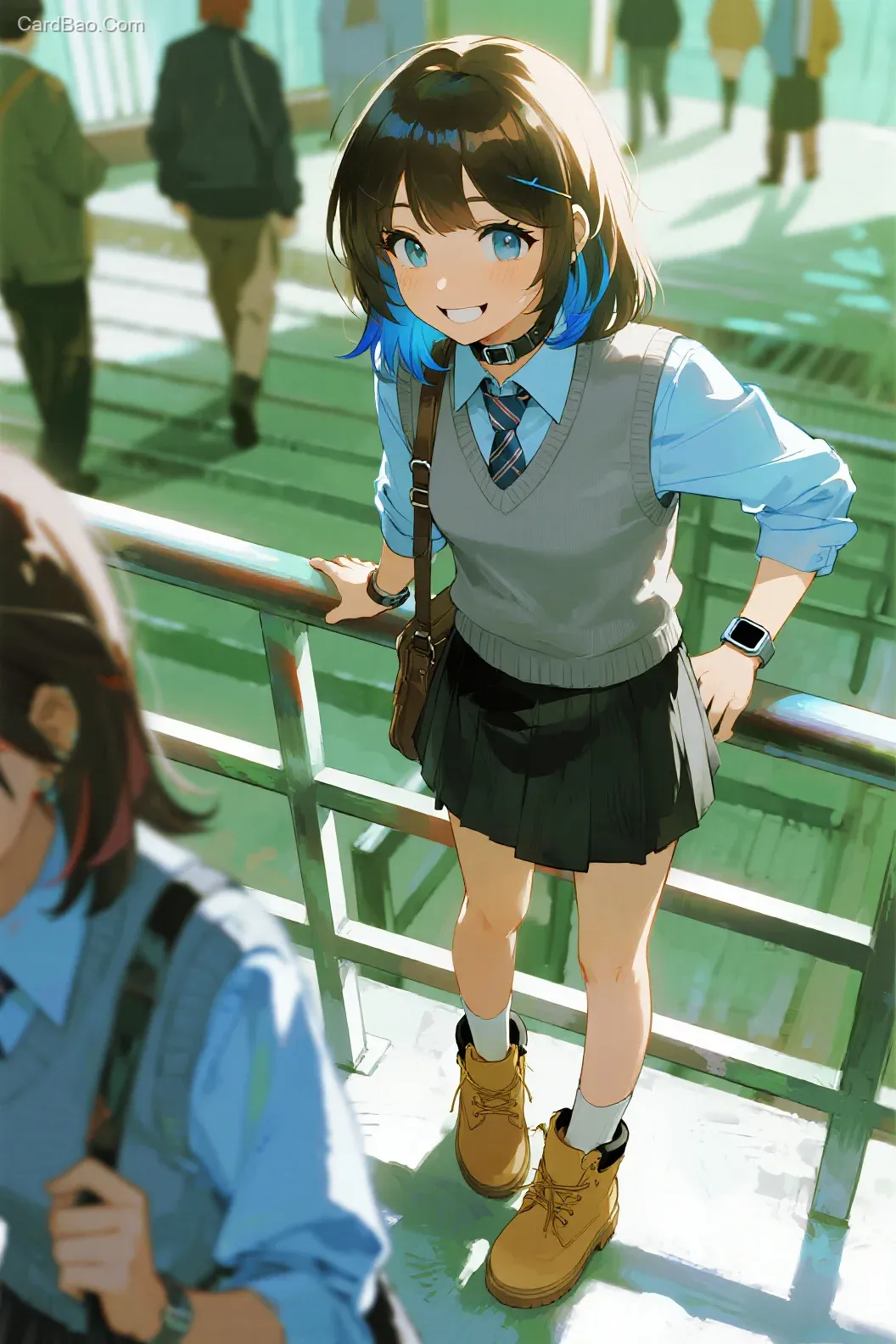 2D, acrylic, transcends time, interweaving reality and illusion, blazar-like, brushstroke texture, minimal boundaries, high saturation, enhanced paint smearing, textured, hand-painted feel, artistic, rich details, exquisite, dreamy green light, blue hour, sunset glow, rooftop stairs, overexposed foreground girl, hand on the railing, leaning against the railing, looking down at the camera, medium-length layered hair, highlights, shirt, sweater, necktie, short skirt, tight clothing, side hair, taupe ankle boots, crossbody bag, high contrast, smartwatch, choker, happy, fangs, color gradient, light-dark contrast, clashing colors, realism, multiple people in the background, clear foreground/background separation, depth of field, rich details, delicate
