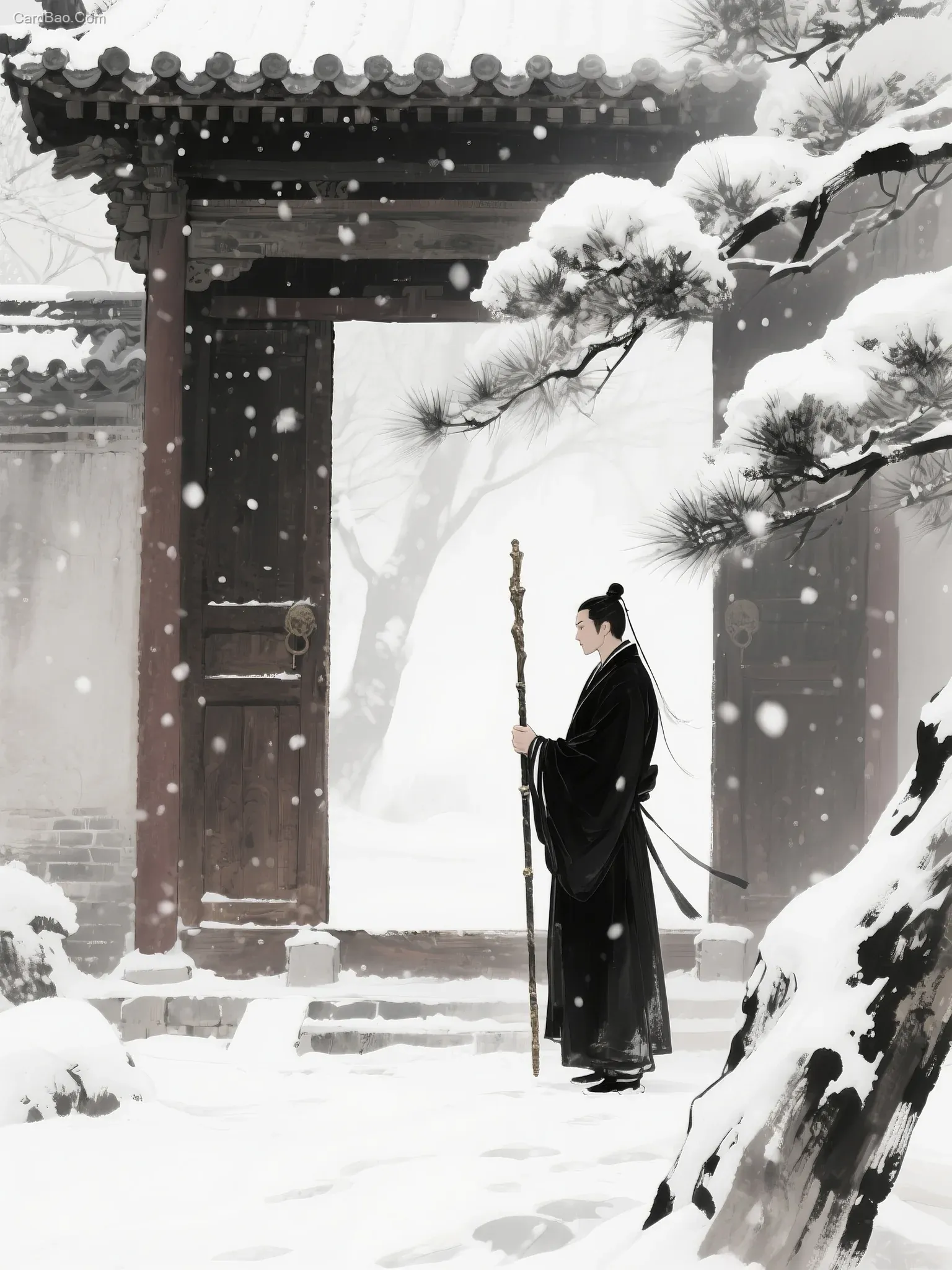 雪中古寺门廊,黑衣侠客持禅杖特写,纵深透视强化人物主体,虚化的雪松和寺檐用淡墨描绘,大面积留白处理飘雪,宁静致远的传统水墨意境