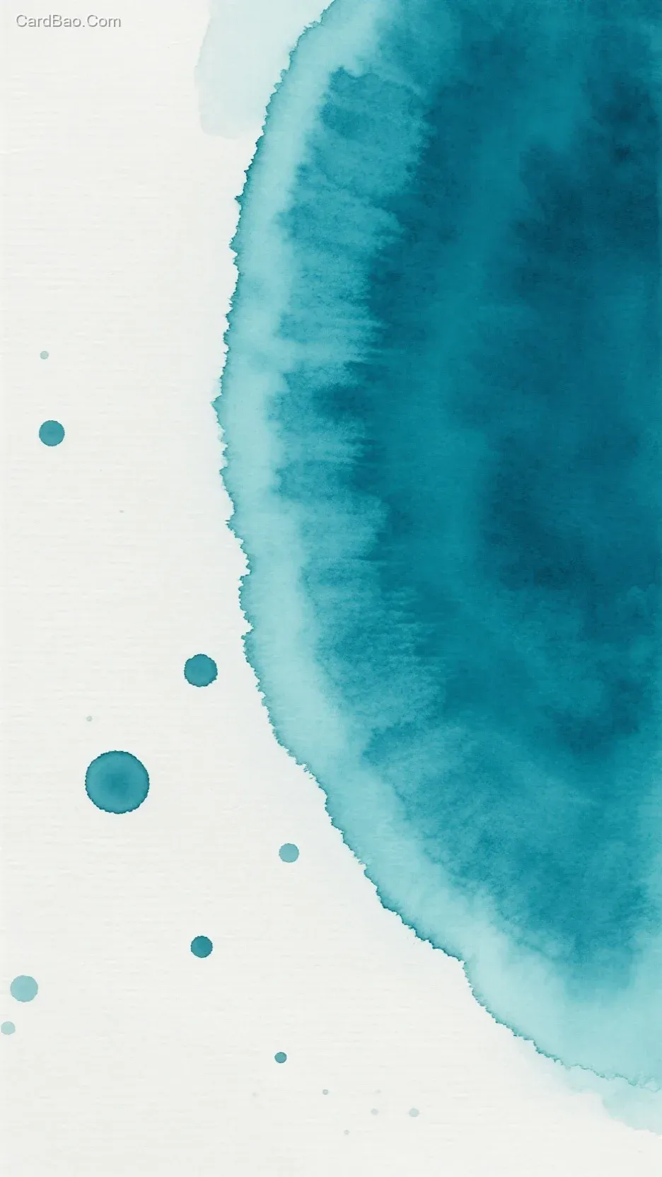 大面积留白,白色背景,极简风格,不经意间的一笔水墨画,蓝绿色,由小水滴到大面积晕染
