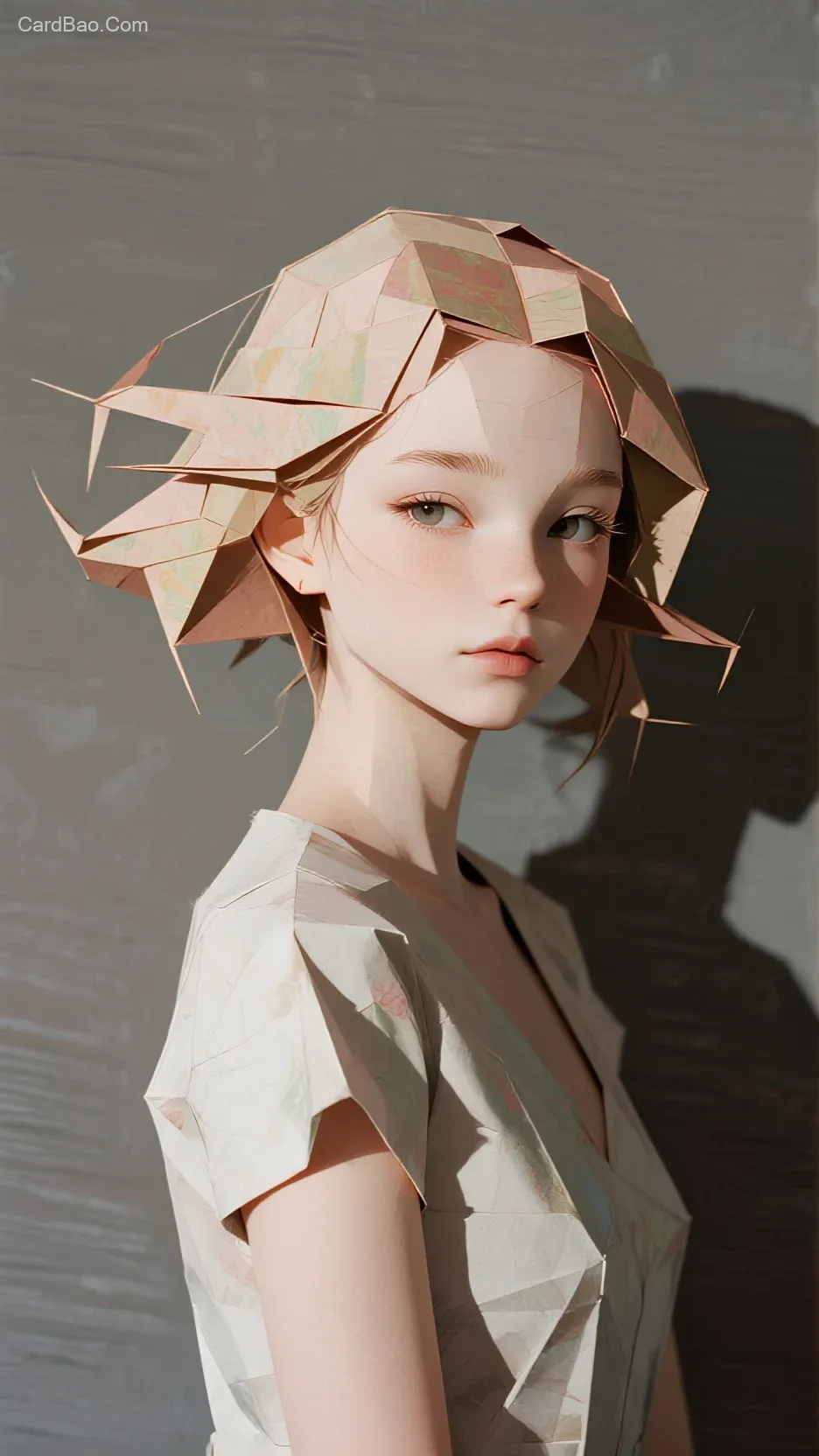 一个折纸风格的女孩,具有精细的纸状结构,她的衣服和头发由折叠的纸元素构成。融入微妙的纹理和渐变色,模仿精致折纸的外观。运用柔和的阴影和高光来增强纸折的三维效果和真实感。