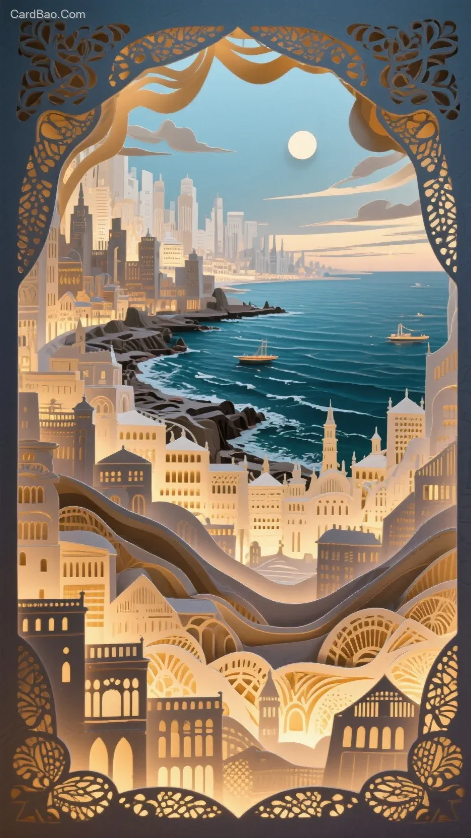 Mucha-style papercut art with layered lighting, featuring a seaside cityscape generated using fractal algorithms. Multi-layered papercut artwork with distinct and well-defined layers, intricate details, and ultra-high-definition 32K resolution.