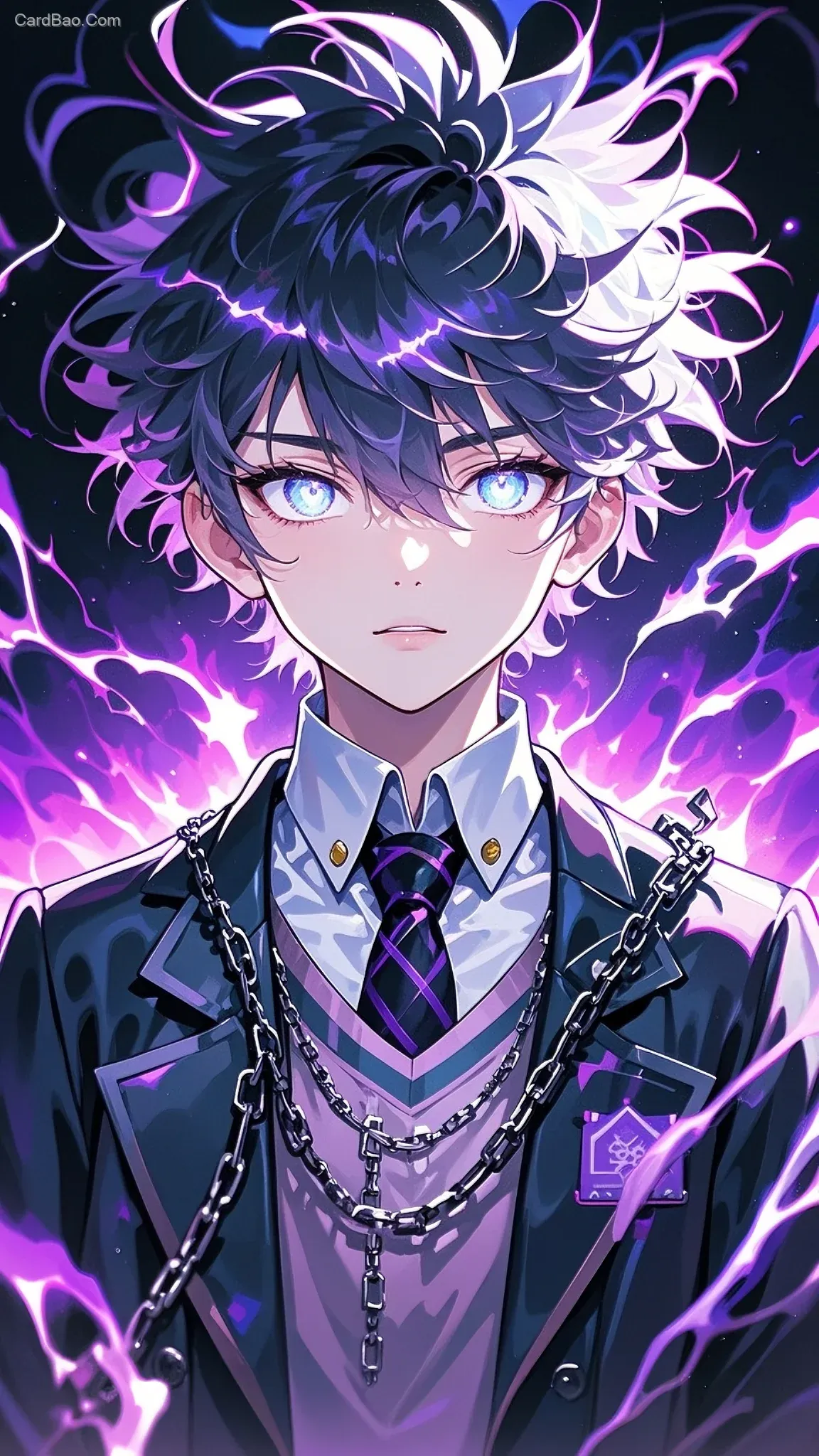 Japanese-style illustration, a boy with explosive hair, eyes in a translucent state similar to the background. The background features purple auroras with prominent three-dimensional shadows. He wears a school uniform with a standing collar, and five or six chains pierce through the image from top to bottom. The character appears to be in a supernatural rampage state.