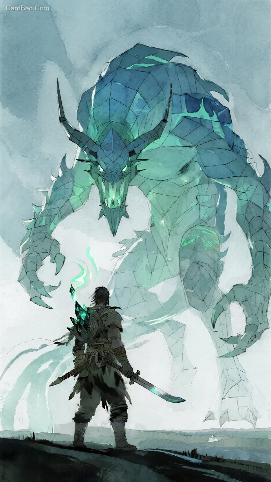 抽象钢笔画与水彩融合,猎人侧影持匕首采集魔兽晶核,几何线条勾勒魔兽鳞甲与尖角,淡绿+湖蓝水彩晕染生物荧光,采集动作拖曳半透明光痕,画面四周极简留白,背景湿画法浅灰蓝雾霭