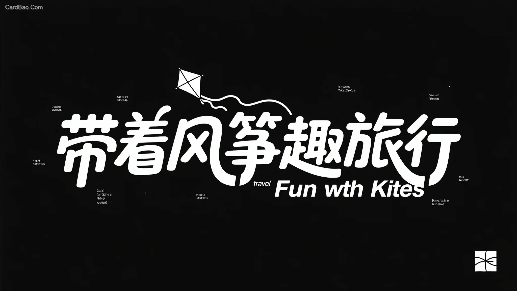 White text on pure black background. Please write "带着风筝趣旅行" paired with the English phrase "Travel Fun with Kites" in a creative title font design, as a logo. It should convey a lively, relaxed, and free-spirited feeling. The font should have variations in size, uneven lengths, and an asymmetrical layout. The strokes should be decorative, smooth, and feature clever ligatures between characters, with certain echoes and connections between strokes to enhance the font's cohesion and fluidity, making the entire design visually more continuous.