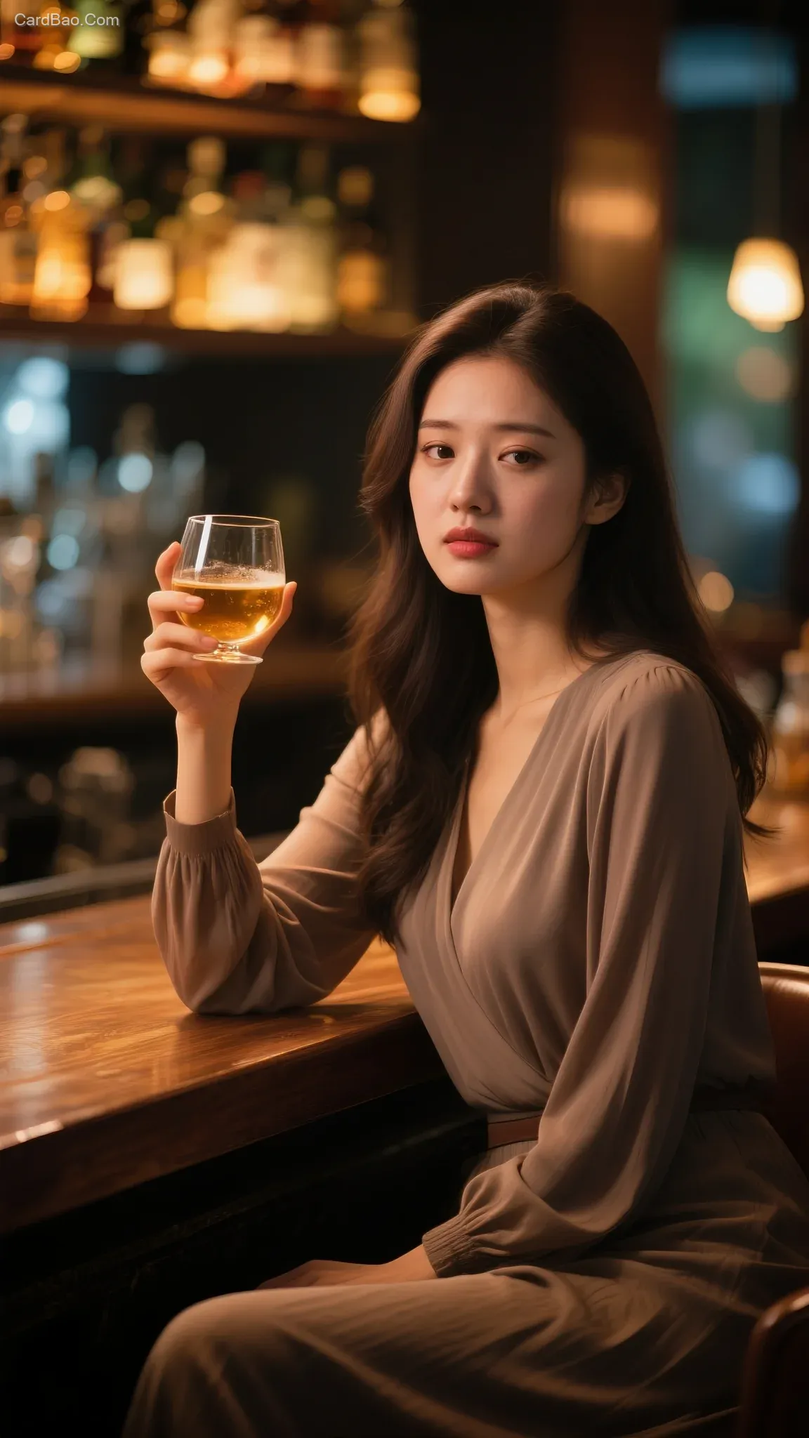 A very beautiful and captivating woman. She is wearing long-sleeved clothing. Sitting in a bar, raising a glass with a melancholic expression, creating a warm and harmonious scene. Extremely beautiful. High-definition image.