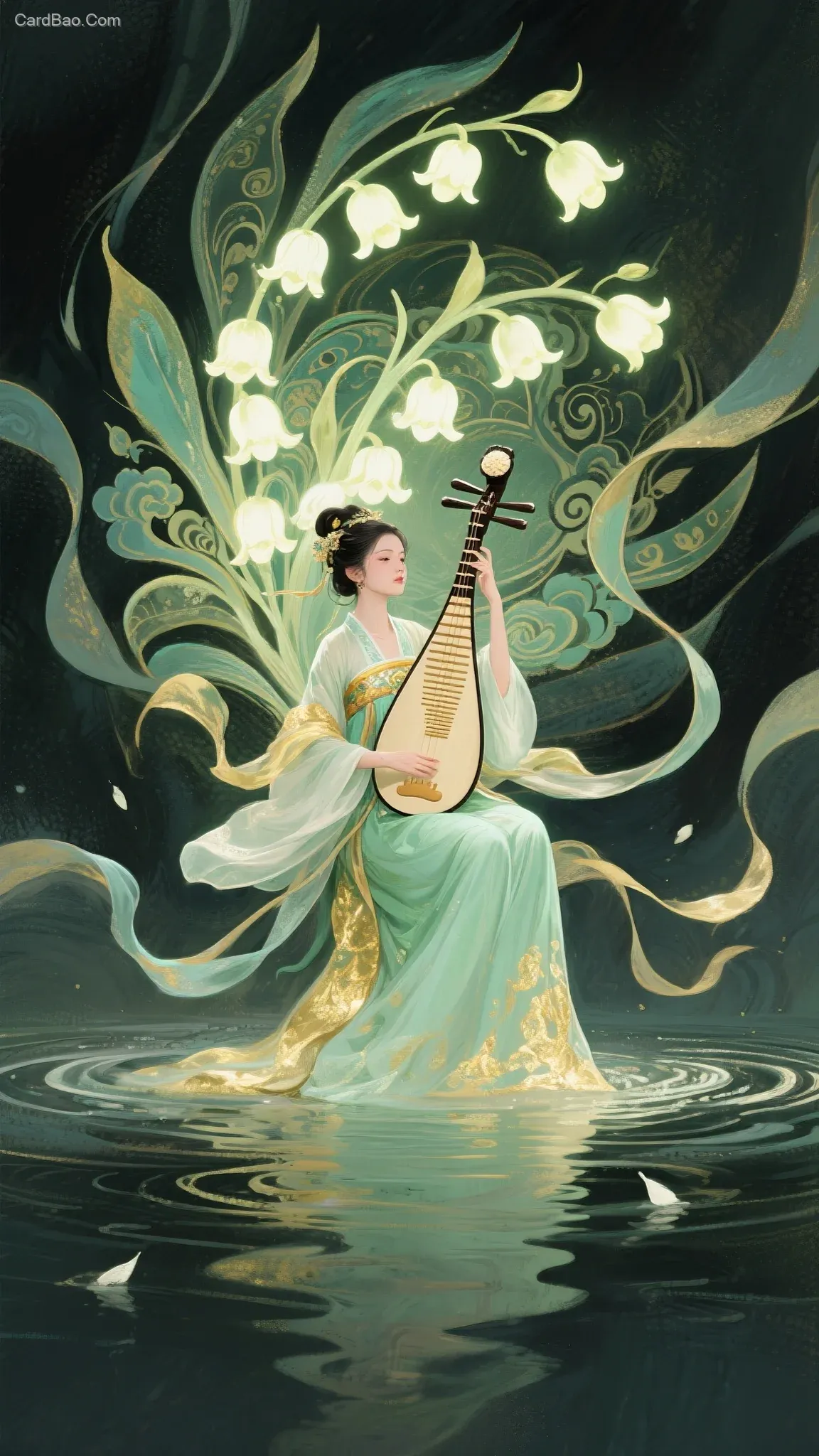 正面,远景,大风,女,浅绿金配色的唐风襦裙,古典纹样,坐姿,琵琶,环绕的一大片巨大抽象铃兰花发光图案铺满背景,飘动丝带,虚实结合的光影处理,人物实写,深色背景,背景虚化,水面涟漪,纵深感。动态动作,全局朦胧,人物泛光,神秘,活泼,温暖,合理繁复色彩饱满的细节,磨砂肌理绘画,笔触感,写意,浸润,流变,强烈光影明暗对比。