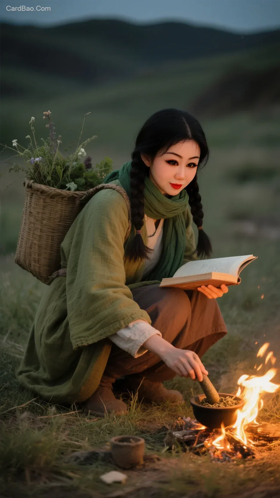夜晚,背着药草背篓,手拿医书,蹲在草地上,研磨草药,燃起篝火熬药